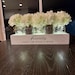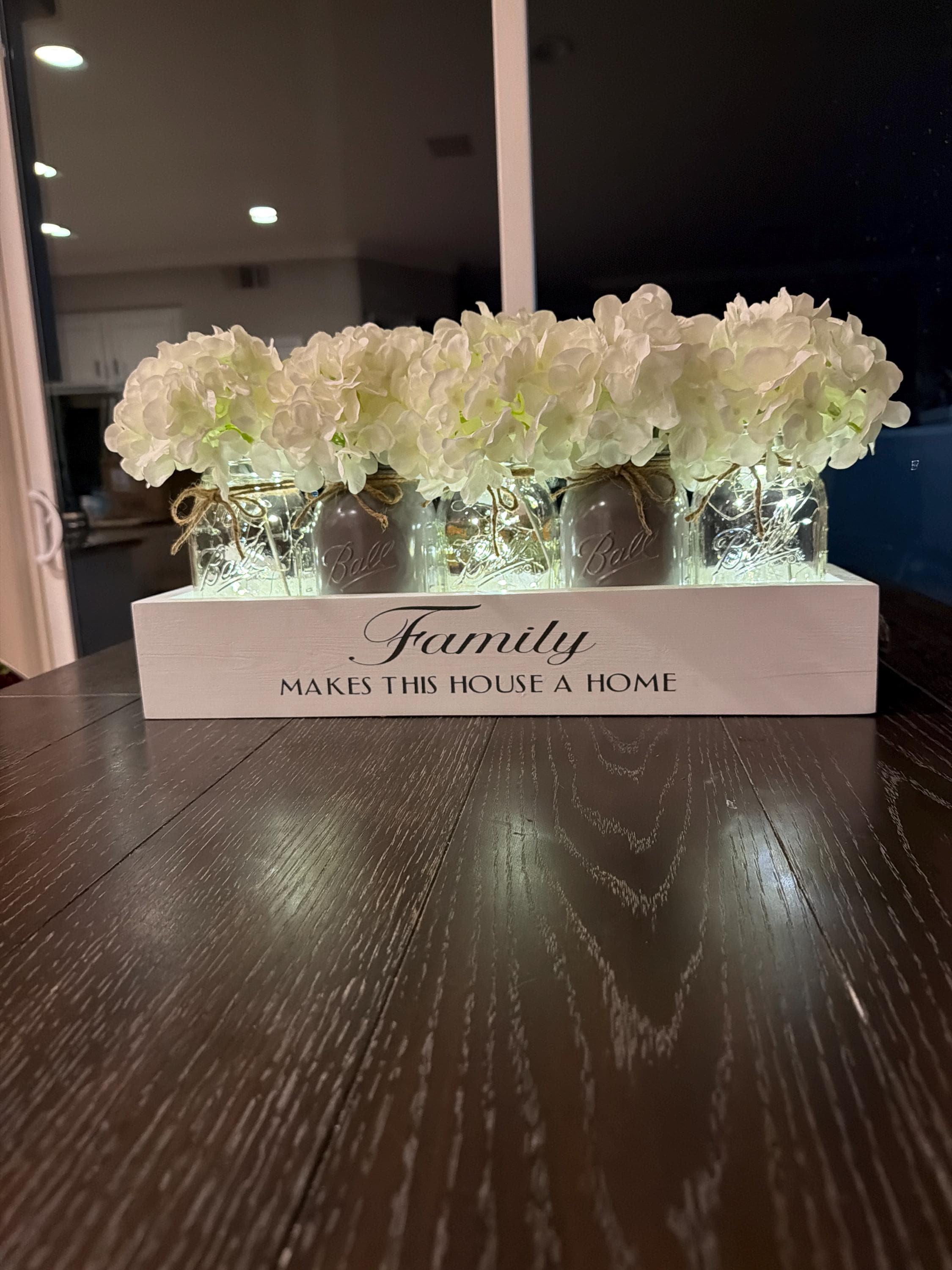 The box has been custom made and painted in a farmhouse white and left clean with NO distress.....the words were painted on in a medium grey and 3 clear lit and 2 slate jars have been painted and twine was added. The jars were also NOT distressed.....the white hydrangea are soo fresh and pretty and the whole centerpiece has such a crisp and clean look.