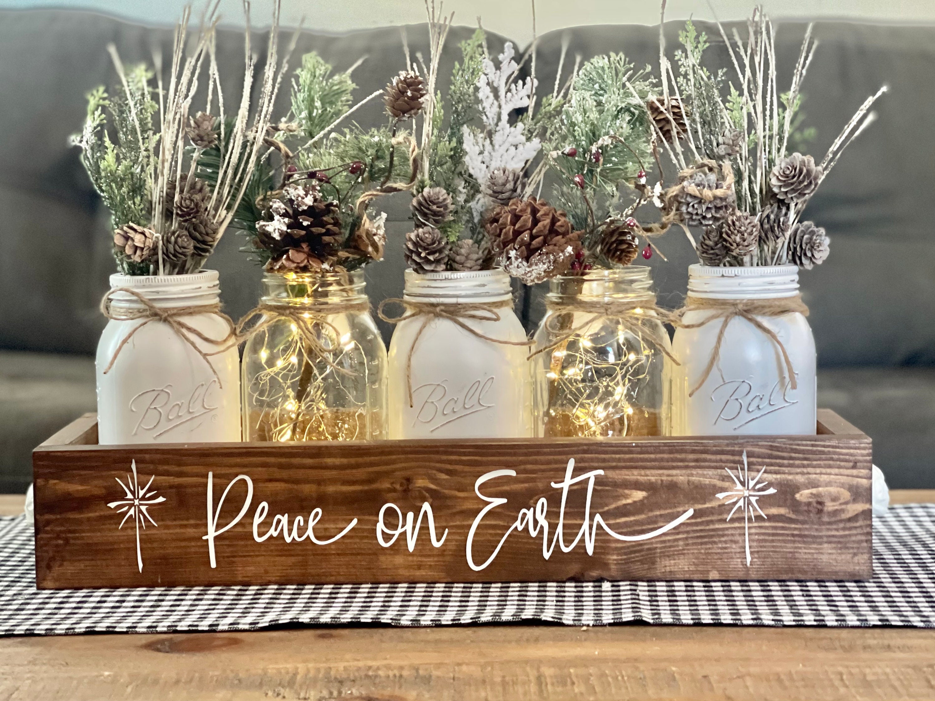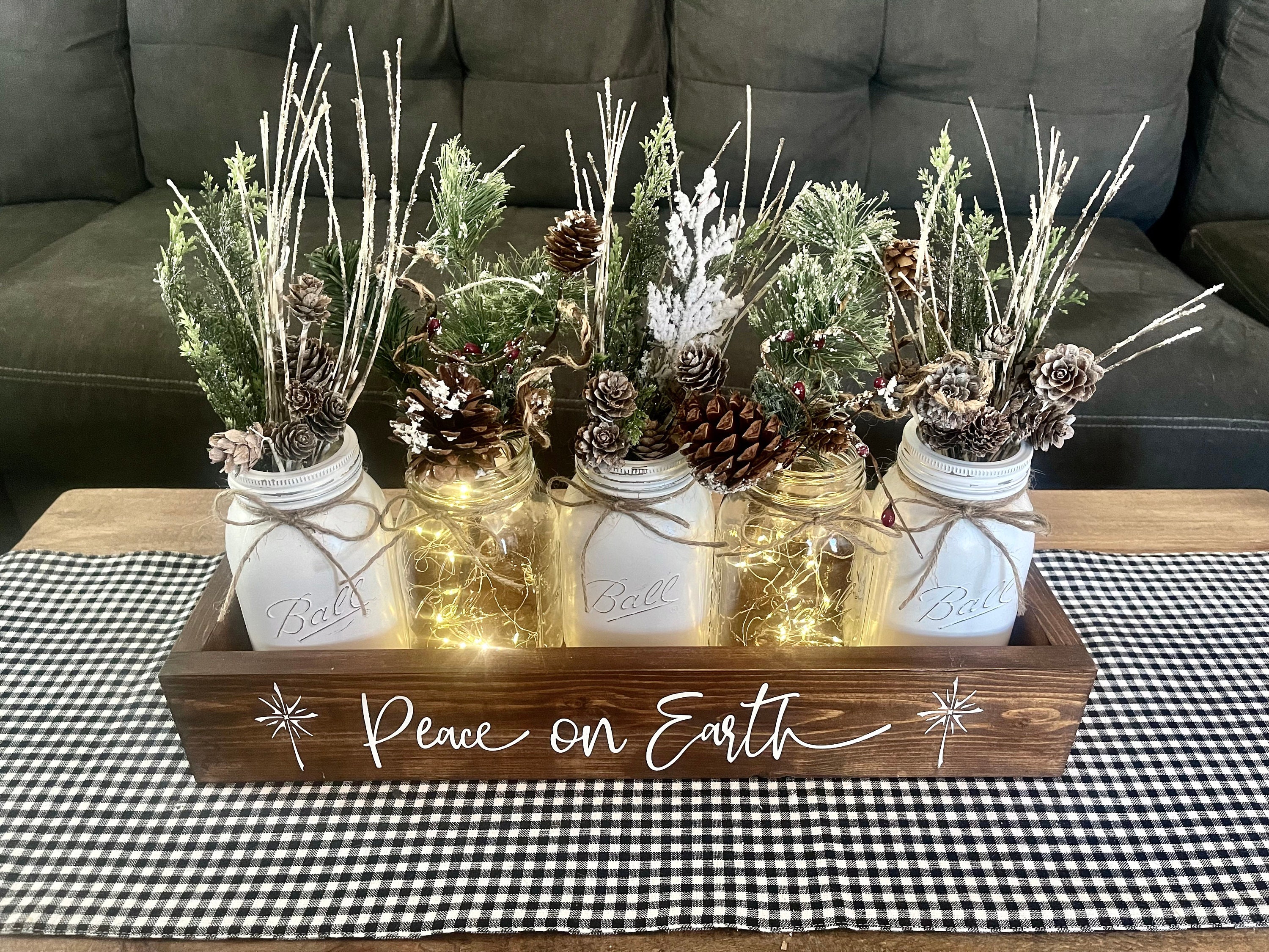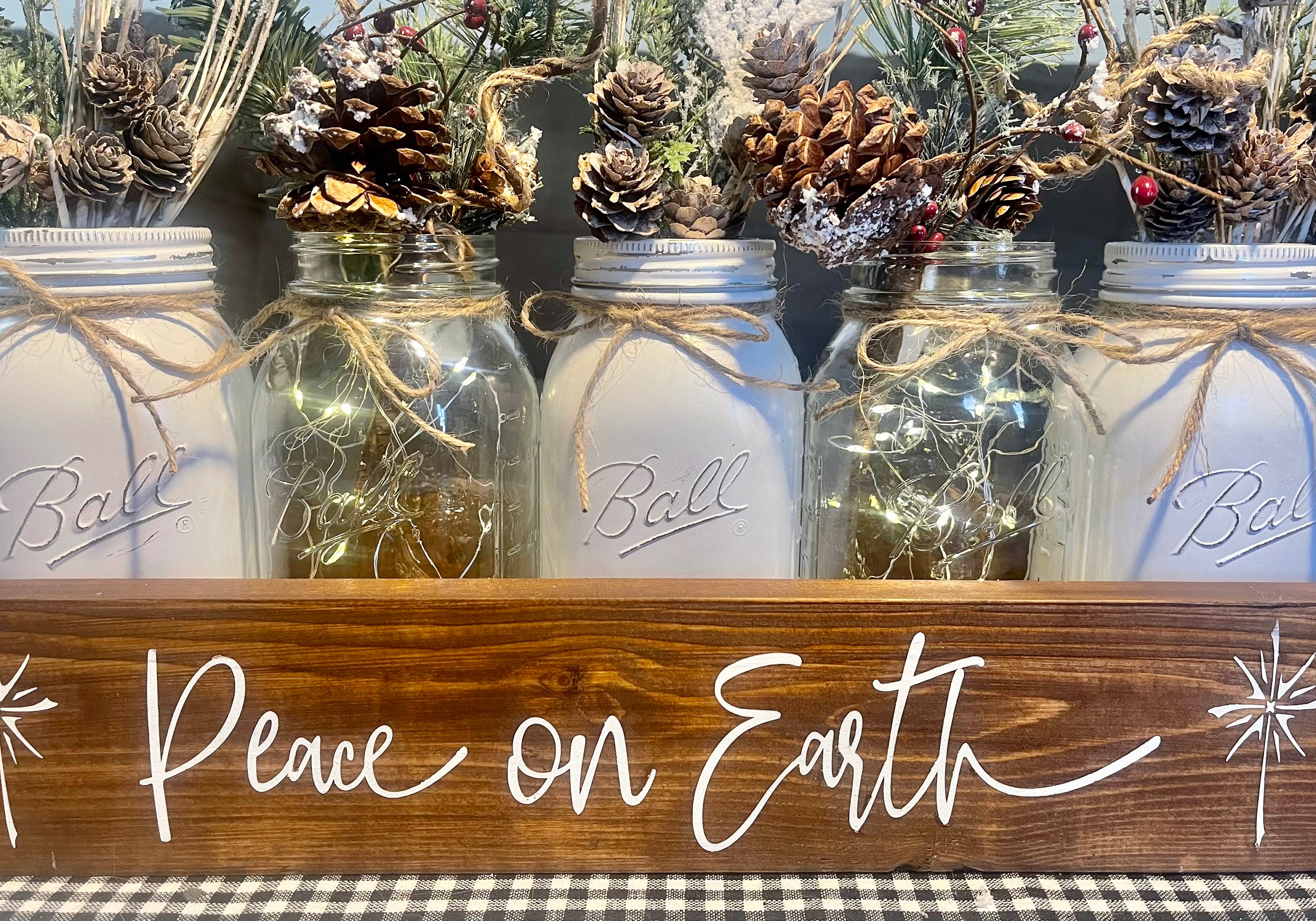 Christmas Mason Jar Centerpiece Winter Farmhouse Holiday Decor Peace On Earth Woodland Table Accent