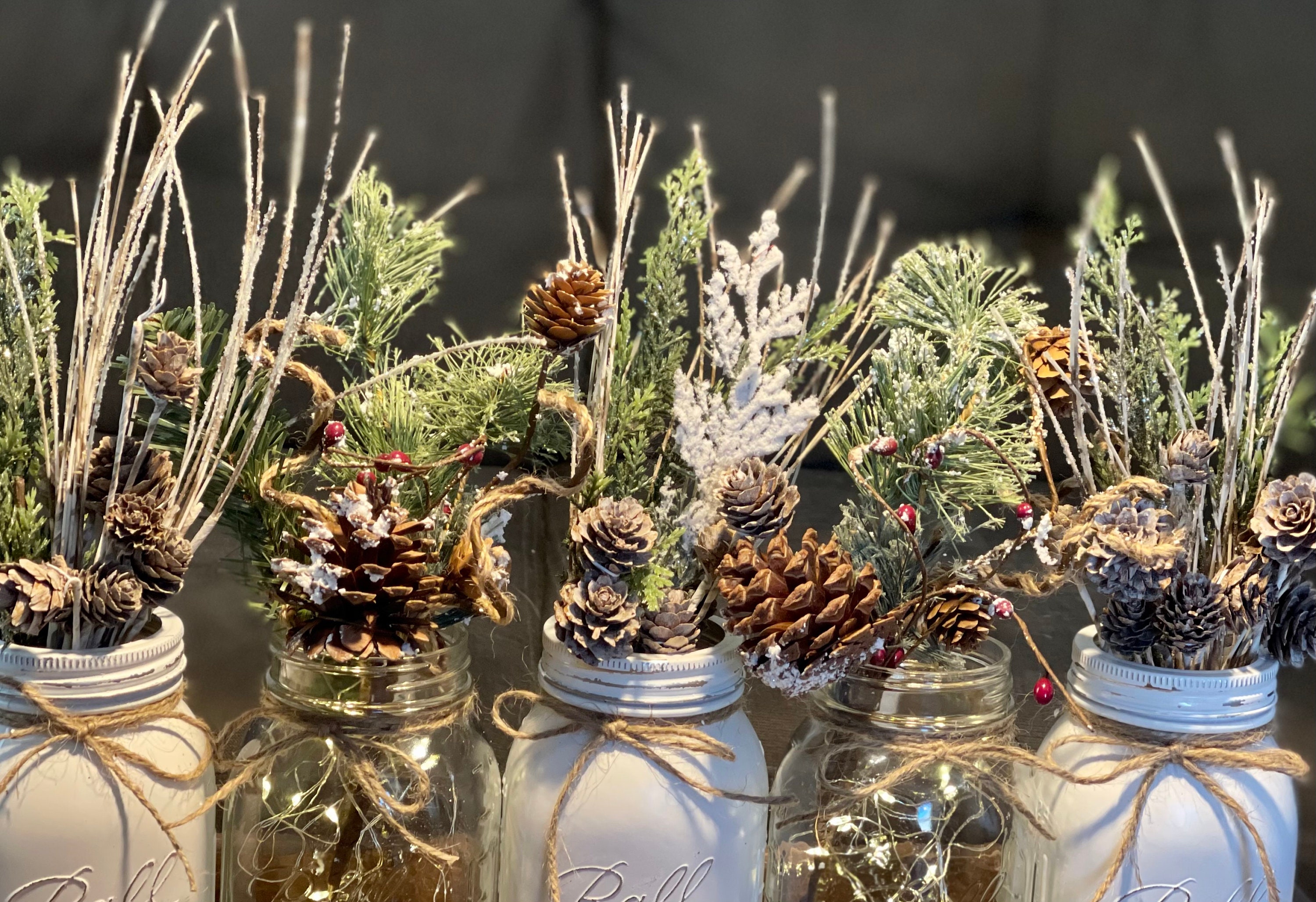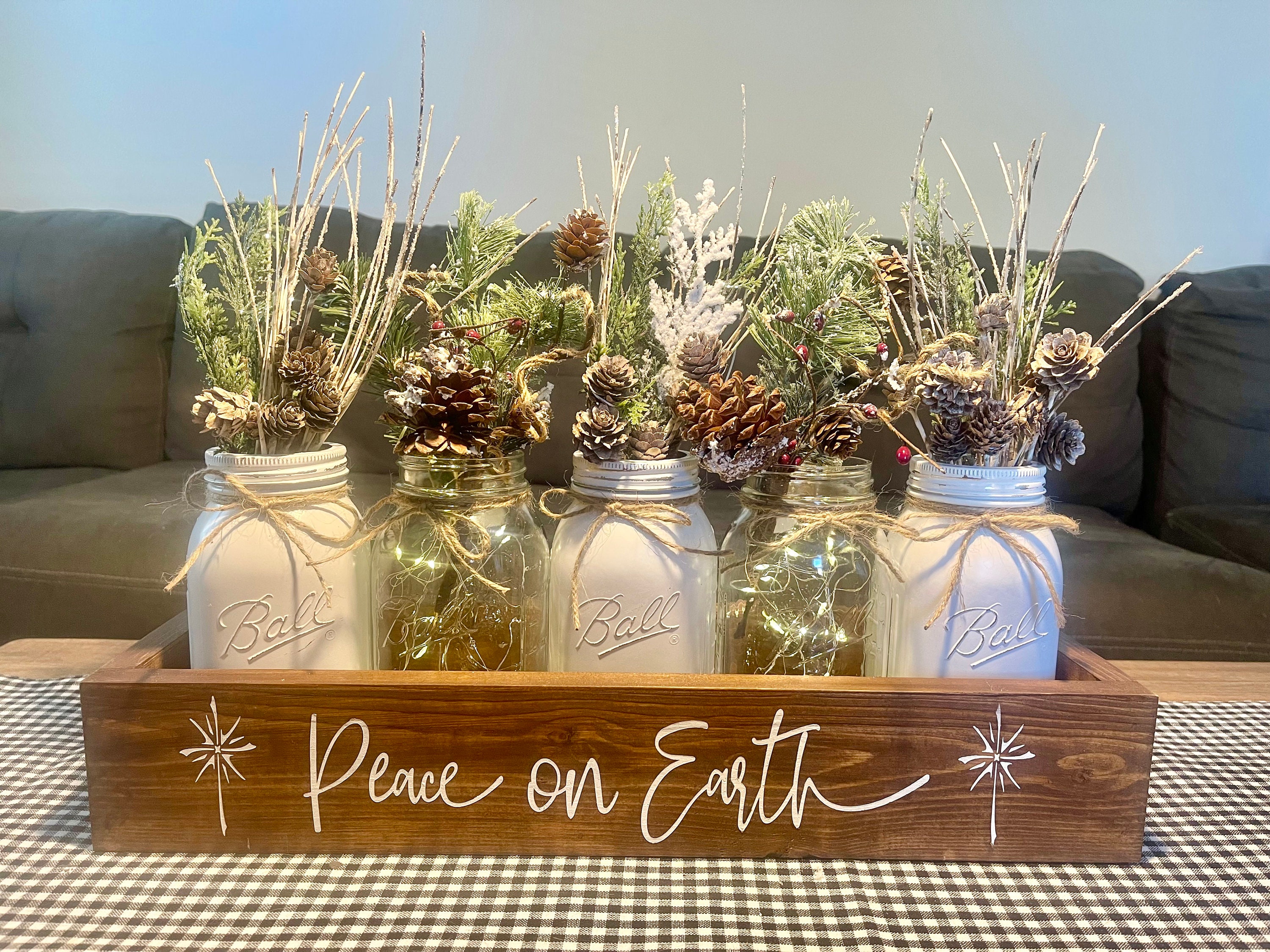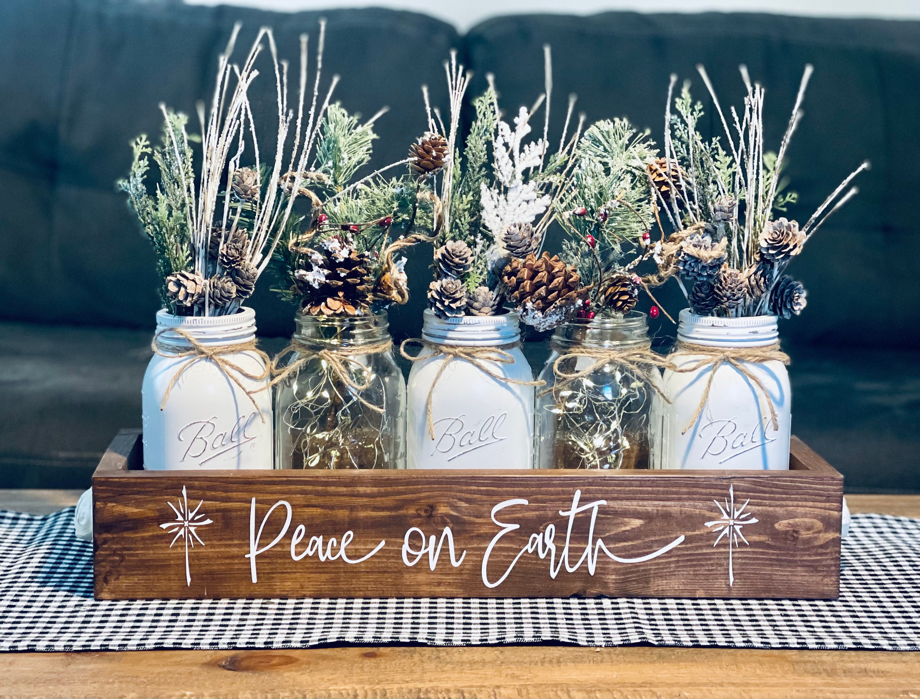 Christmas Mason Jar Centerpiece Winter Farmhouse Holiday Decor Peace On Earth Woodland Table Accent