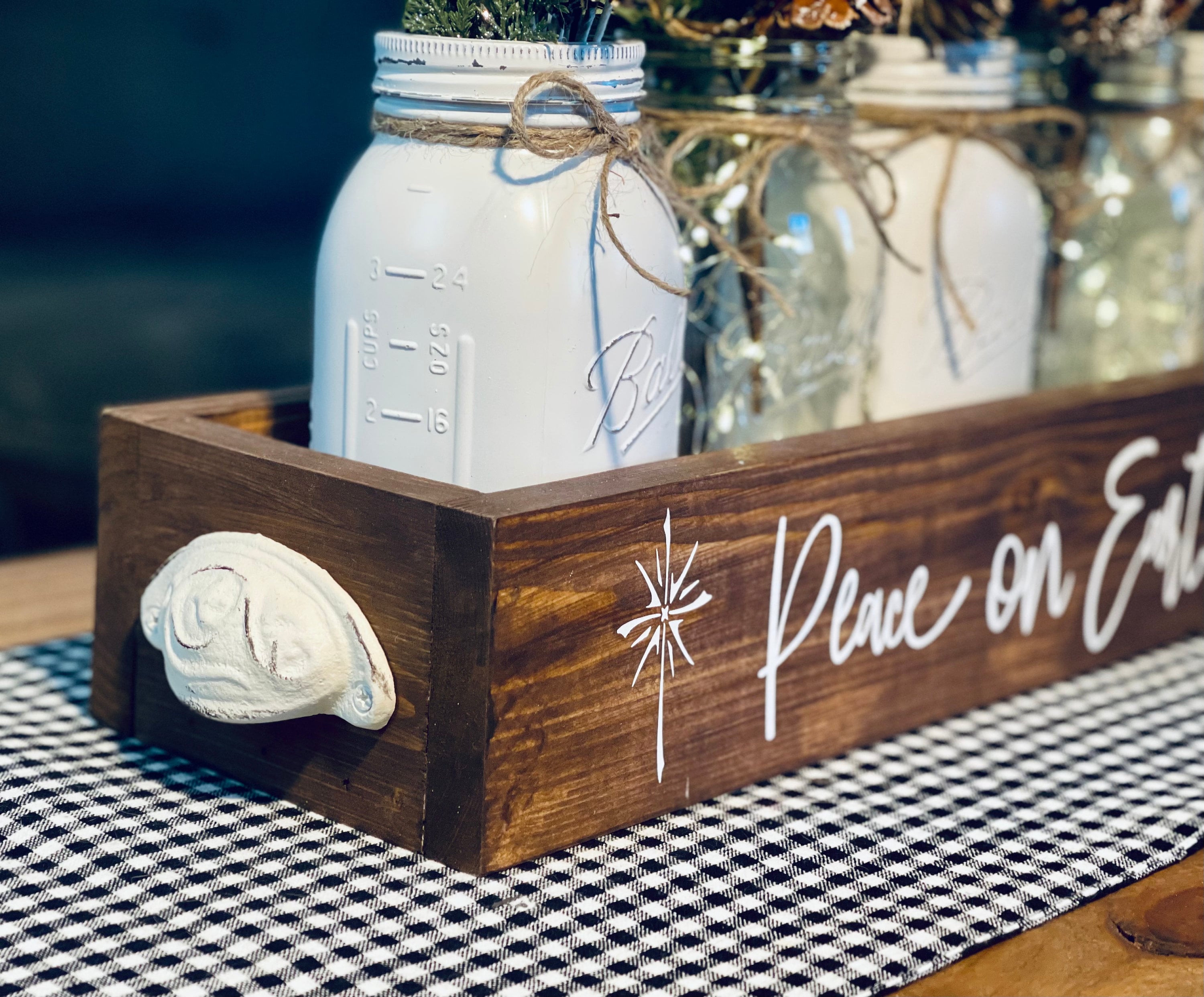 This custom-made box has been stained in a gorgeous American Walnut and the Peace on Earth design has been painted on in white. White jars have been painted and distressed and 2 clear lit ones add a bit of sparkle to your table. The fairy lights have an on/off switch at the top, so you control when they are lit. Gorgeous ivory cast iron handles have been added to complete this one-of-a-kind Christmas Centerpiece and neutral florals and white birch sprigs and pinecones complete it.