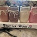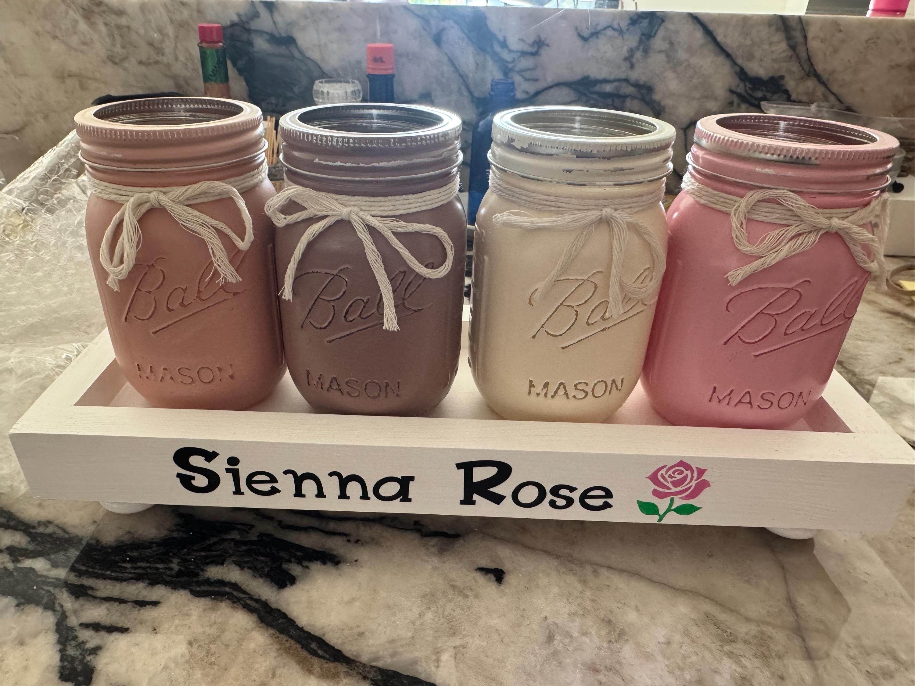 The little box has been painted white and the writing has been added on with a black vinyl and a hand painted flower was added at the end. Ombre painted jars start with linen, mauve, rose and pink...a sweet white twine is added a few times to give it just the perfect touch.