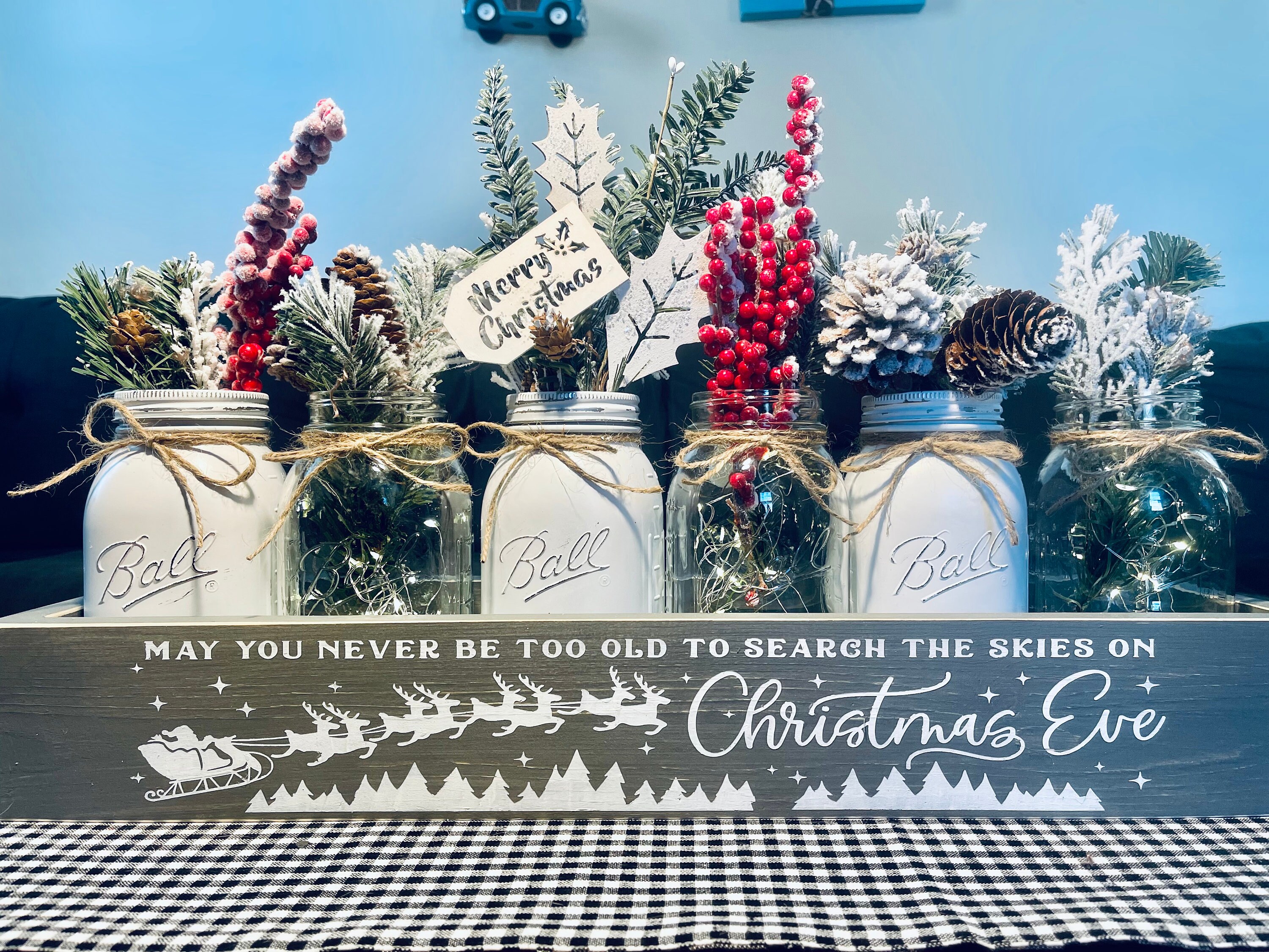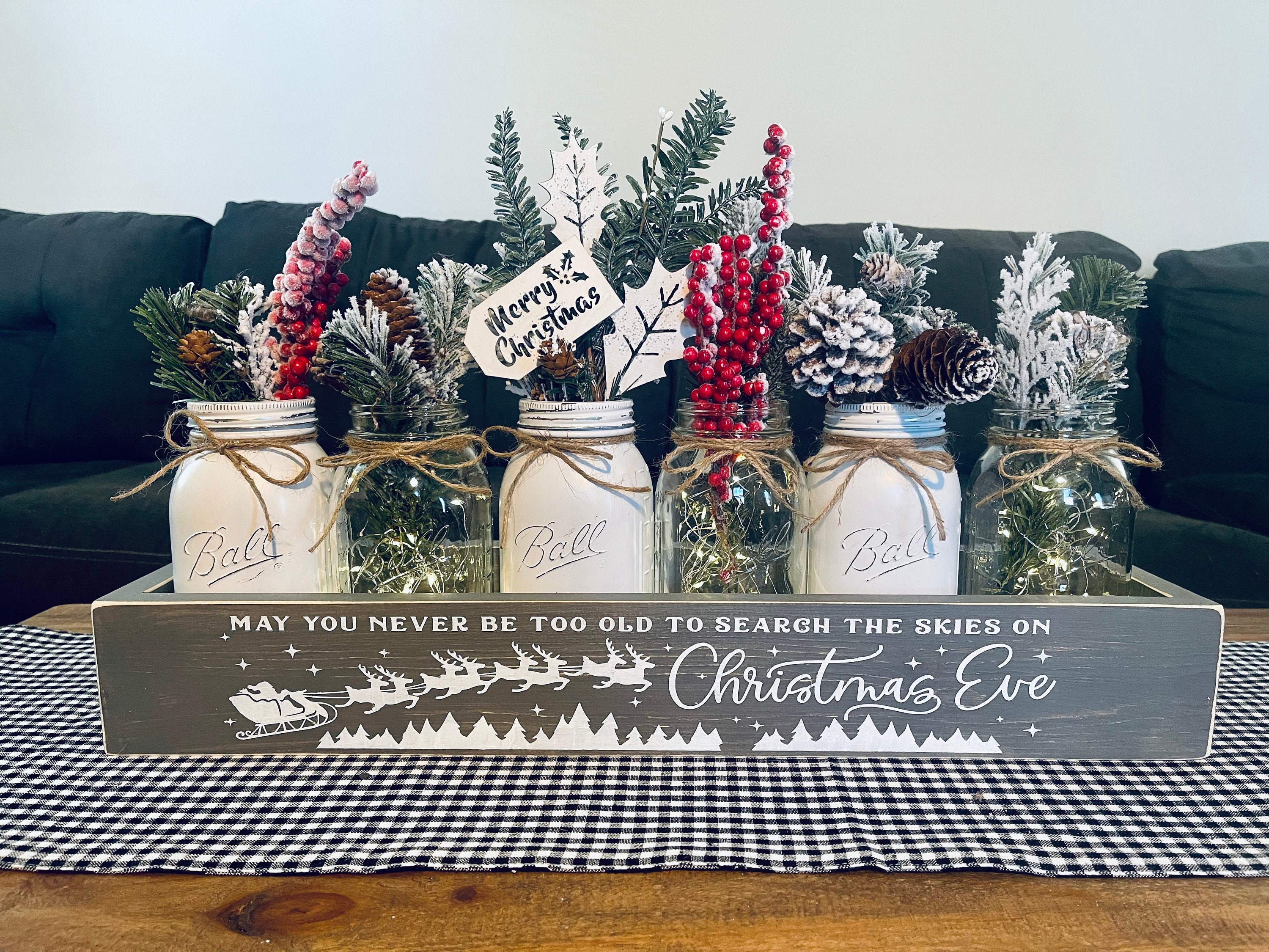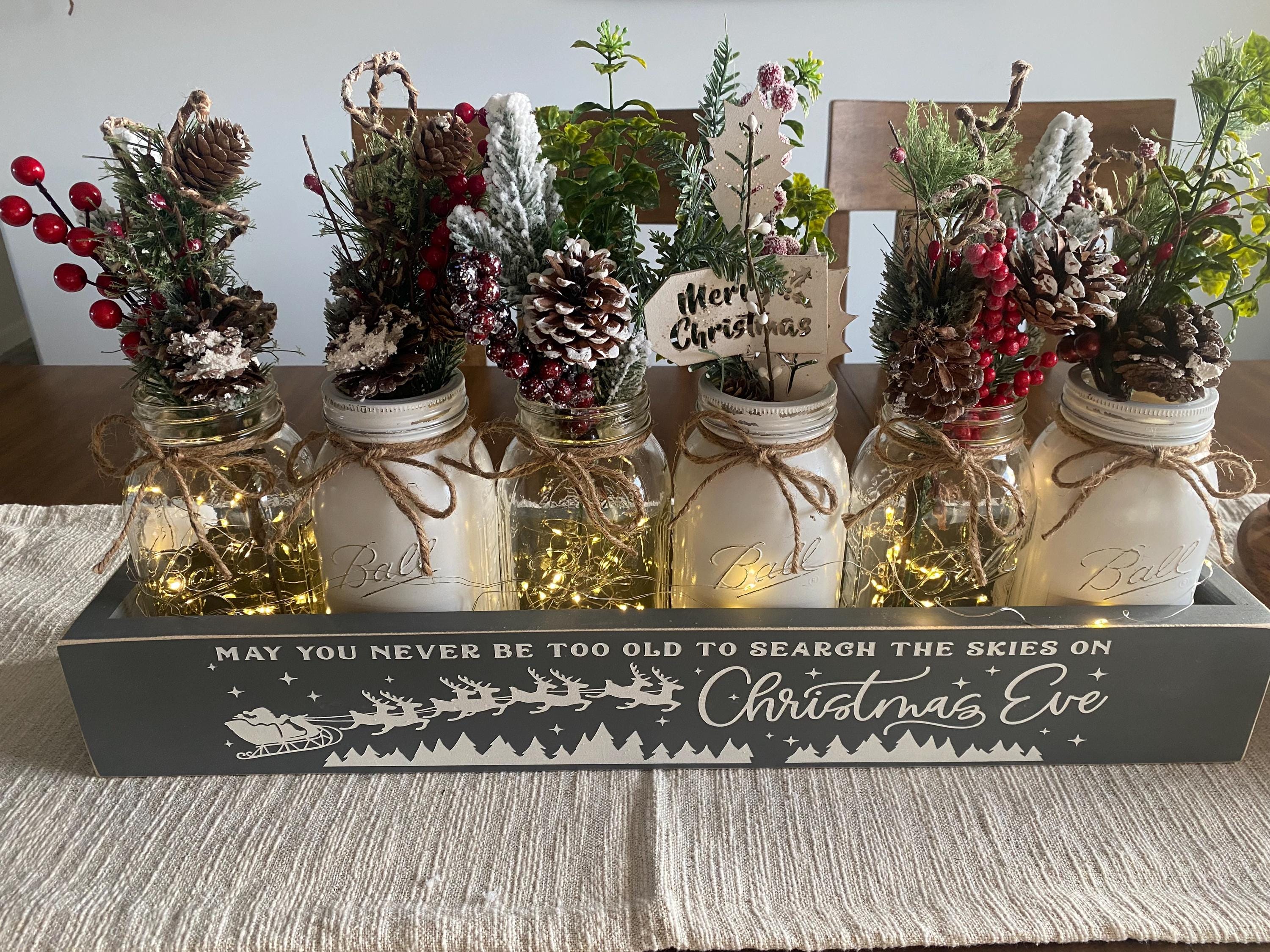 Christmas Holiday Mason Jar Centerpiece Santa Claus Rustic Farmhouse Decor Painted Lit Table Mantle Display Winter