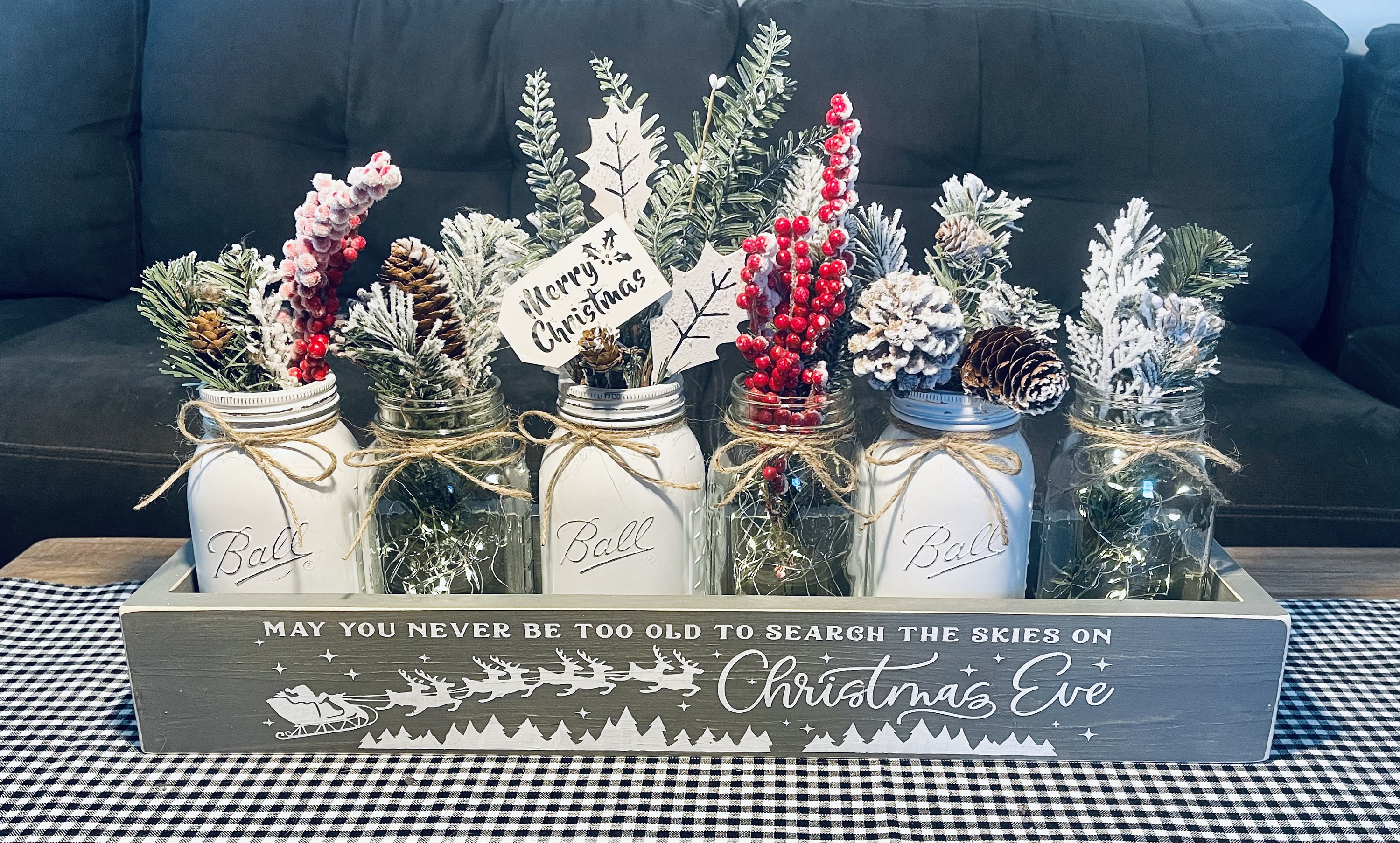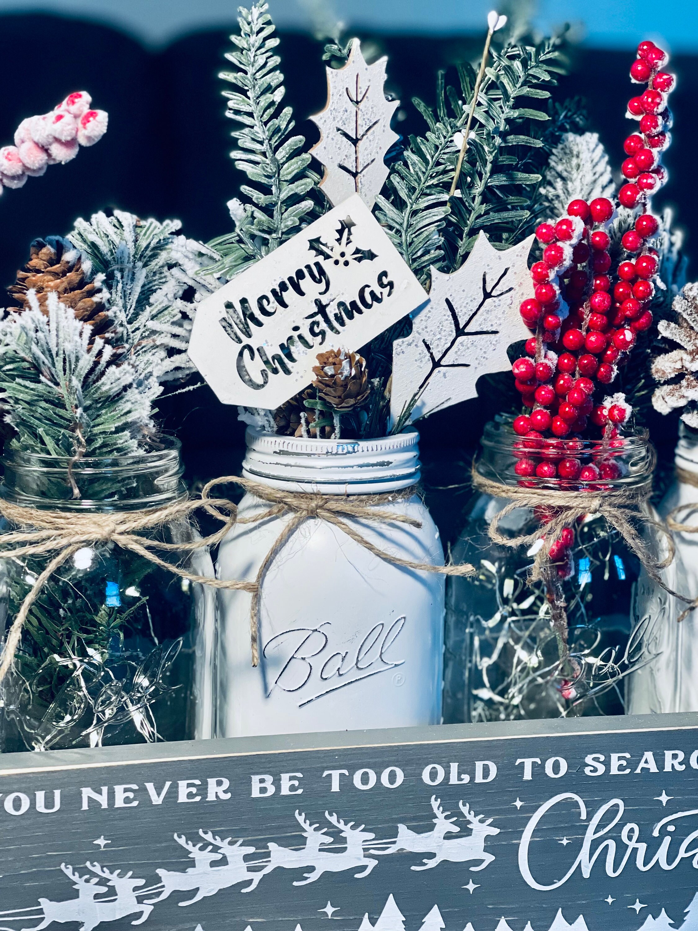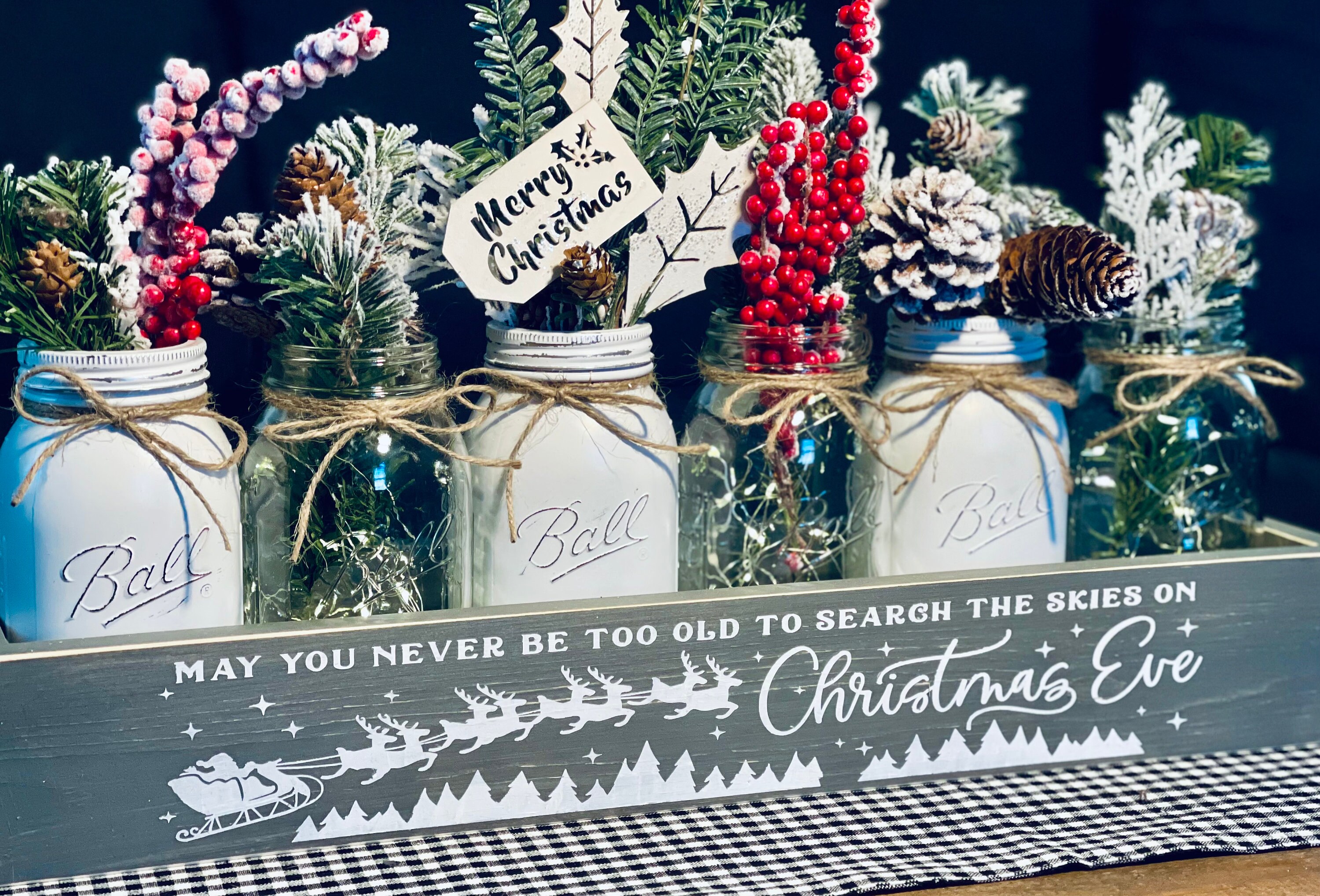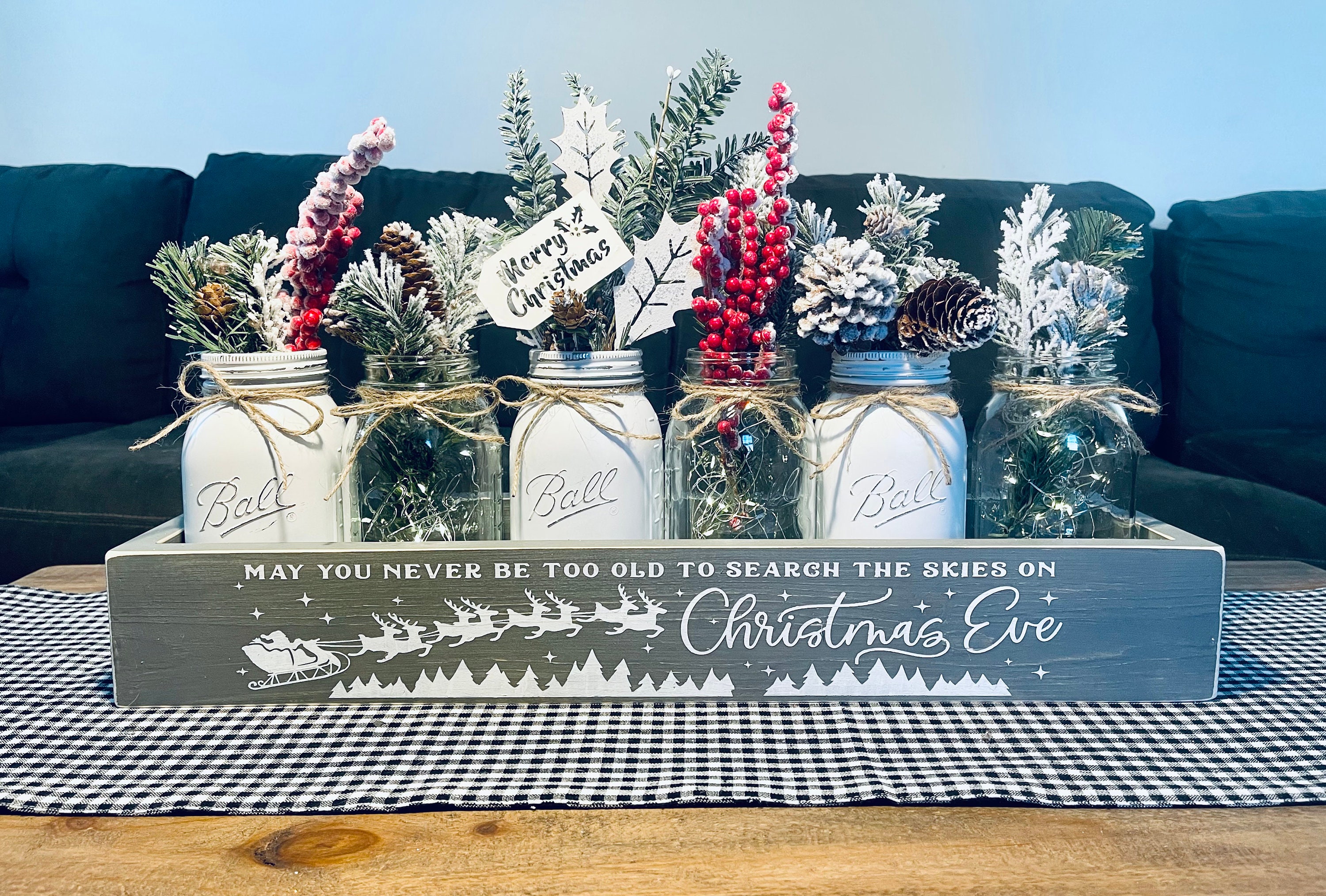 Christmas Holiday Mason Jar Centerpiece Santa Claus Rustic Farmhouse Decor Painted Lit Table Mantle Display Winter