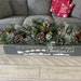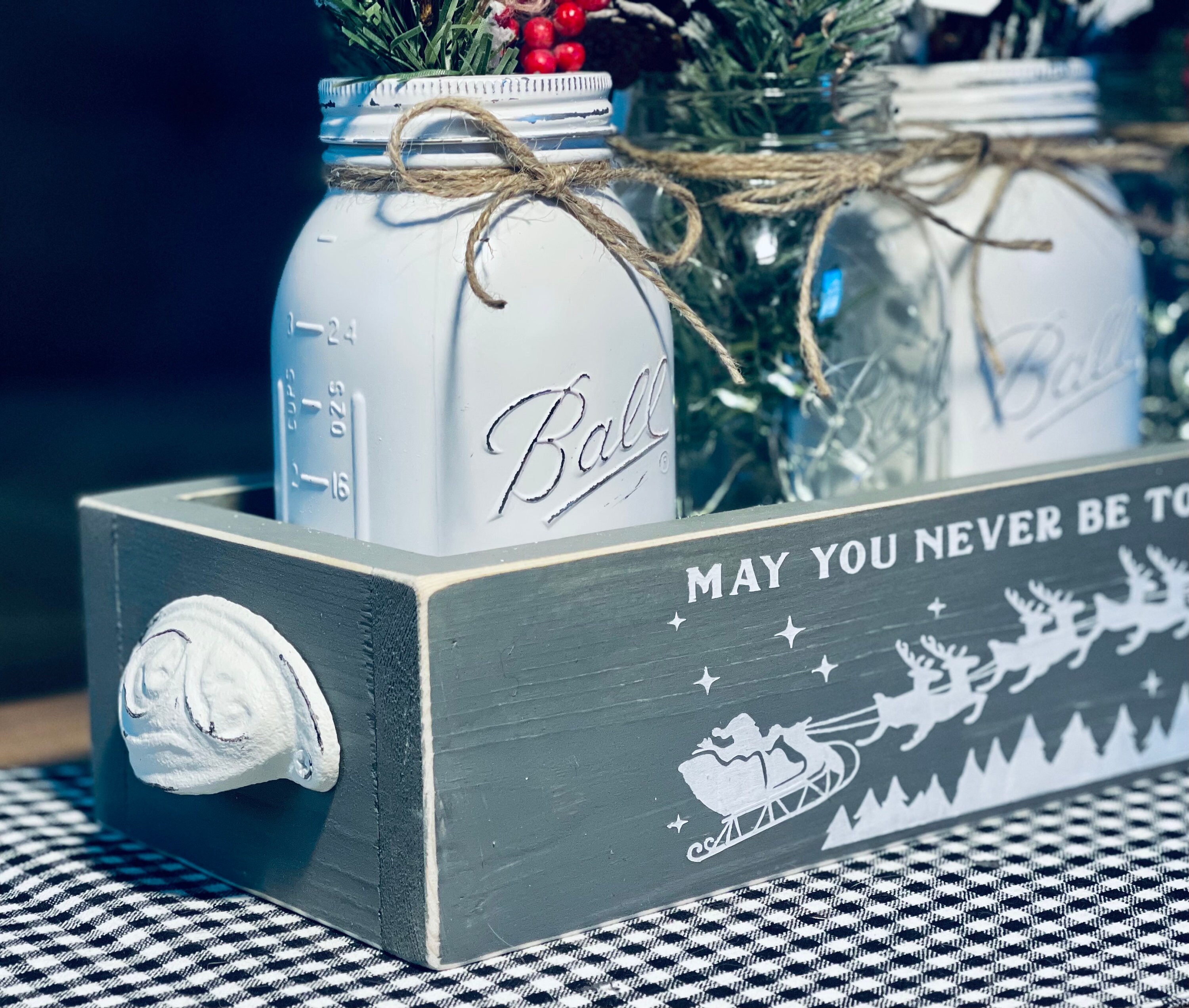 The box has been custom made and stained with a gorgeous medium grey stain and distressed to show a weathered look....the writing is in white to keep it neutral. Gorgeous ivory cast iron handles have been added to the sides to complete the modern farmhouse look and feel. Six mason jars ( shown with 3 white and 3 clear lit) have been painted and distressed a bit and twine has been added. They were then filled with Christmas florals and you get the little sign too!