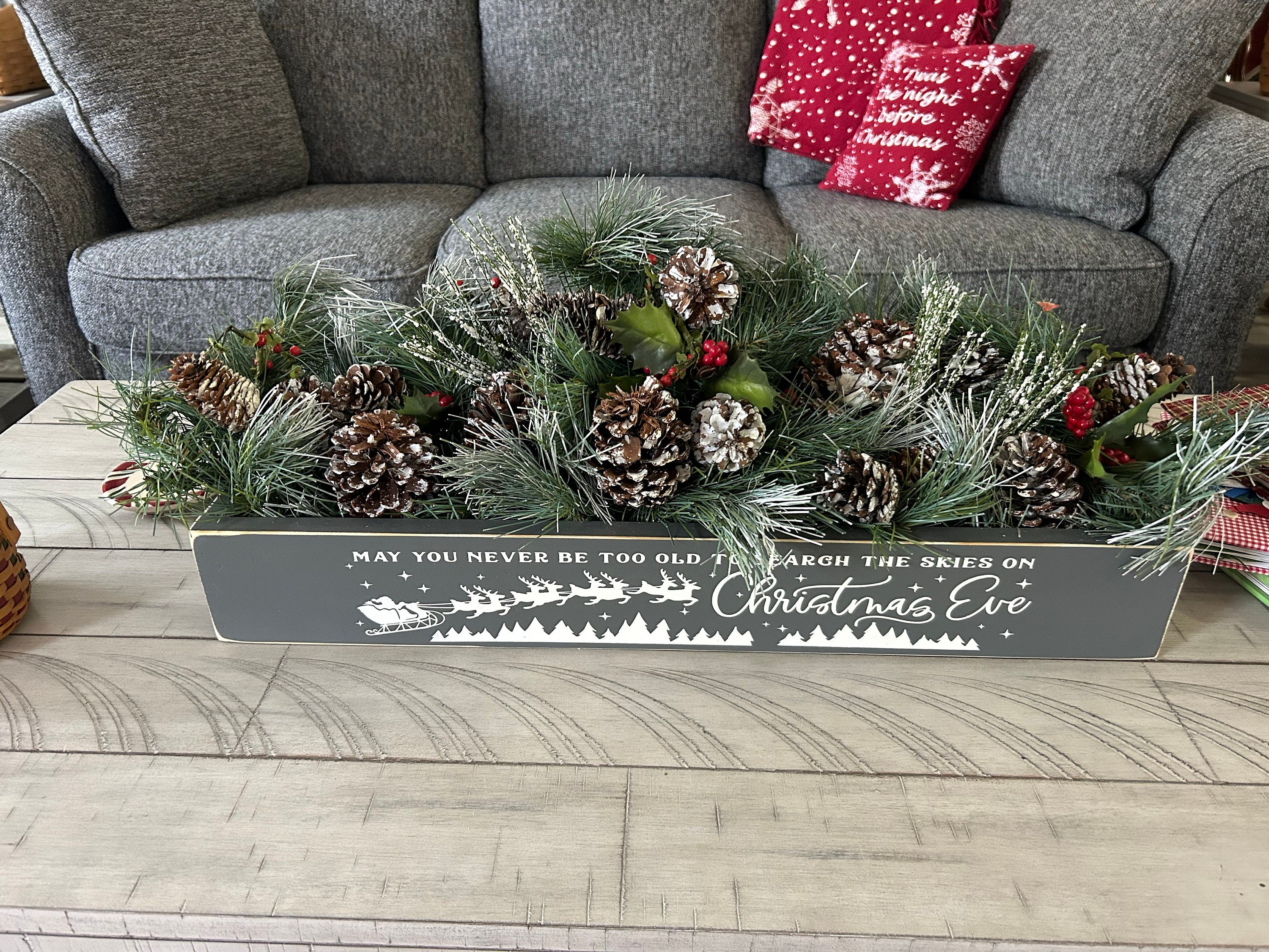 Welcome to our Christmas SHOWSTOPPER!! This vintage farmhouse centerpiece is sure to bring out the inner child in all of us. The rustic and distressed grey box is perfect and neutral for any home decor. It is filled to the brim with frosted branches and berries and pine cones and a cute little sparkly Merry Christmas sign to give it some bling and charm:)