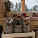 The wood crate box is custom made and torched and stain in our driftwood stain and and 3 pint sized (16 oz.) mason jars were painted in our tiffany and distressed with jute twine added to complete the modern farmhouse look we all LOVE!!!