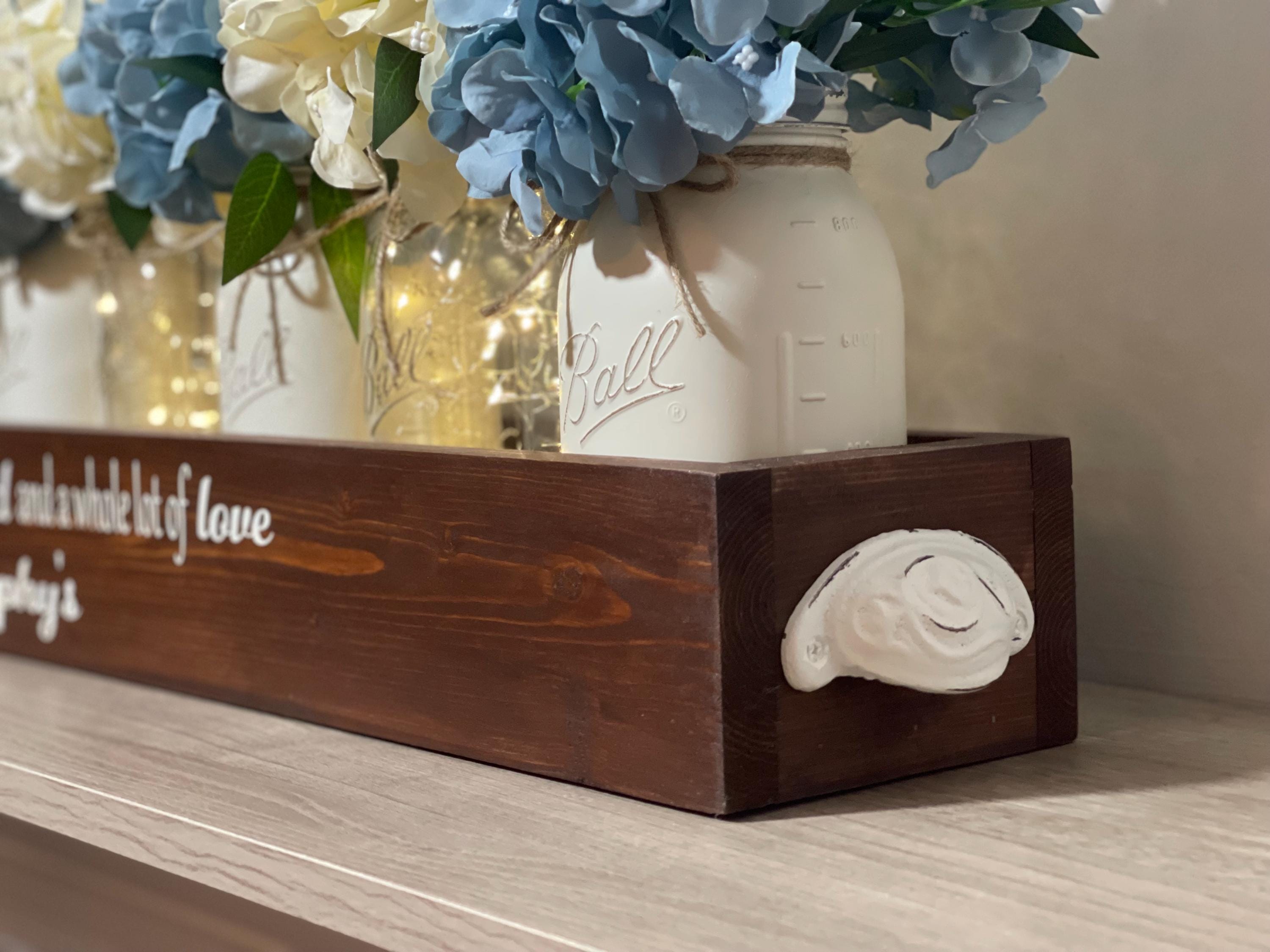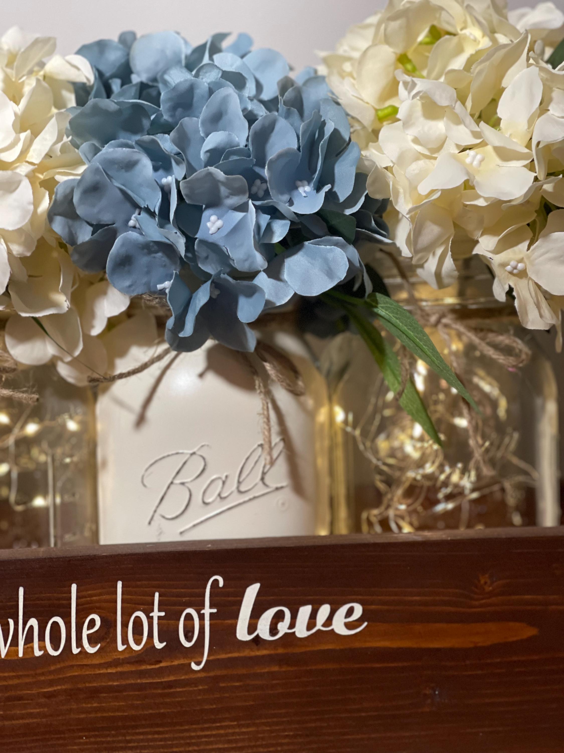 The box has been custom made and stained with a gorgeous deep walnut stain and the writing is in white to keep it neutral. Gorgeous ivory cast iron handles have been added to the sides to complete the modern farmhouse look and feel. Nine mason jars ( shown with 5 linen and 4 clear lit in main photo) have been painted and lightly distressed and twine has been added. They were then filled with huge, gorgeous linen and blue full hydrangea for a modern farmhouse look and you will be the ONLY one who has anything like it:)