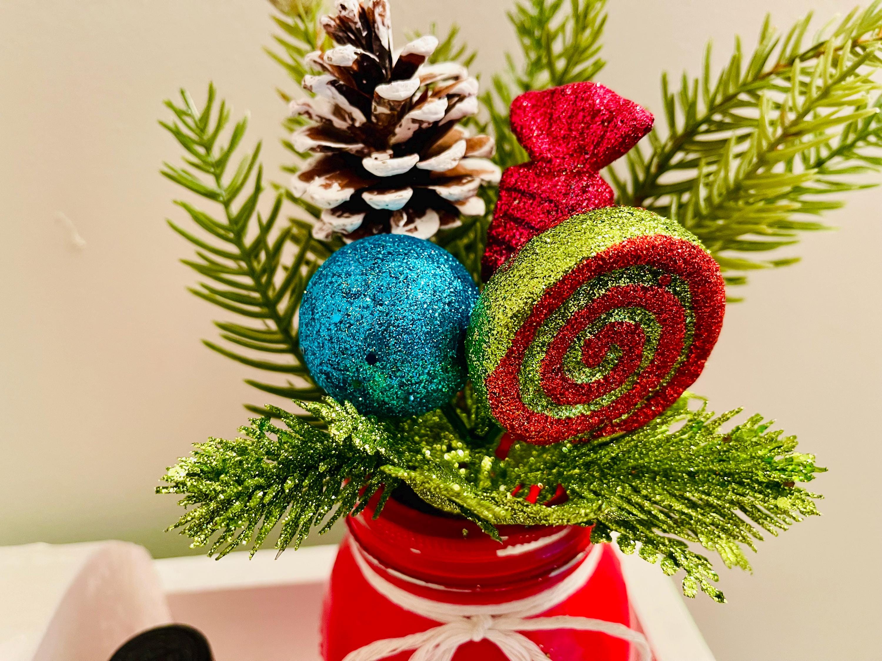 This handmade box has been painted white with a green/red fun triangle design on each side. A glittery GRINCH face has been added for fun and sparkle and finished off with the classic STINK STANK STUNK sign! A candy apple red jar with white twine was added with some fun greenery, a pinecone and glittery accents he is getting ready to STEAL:)