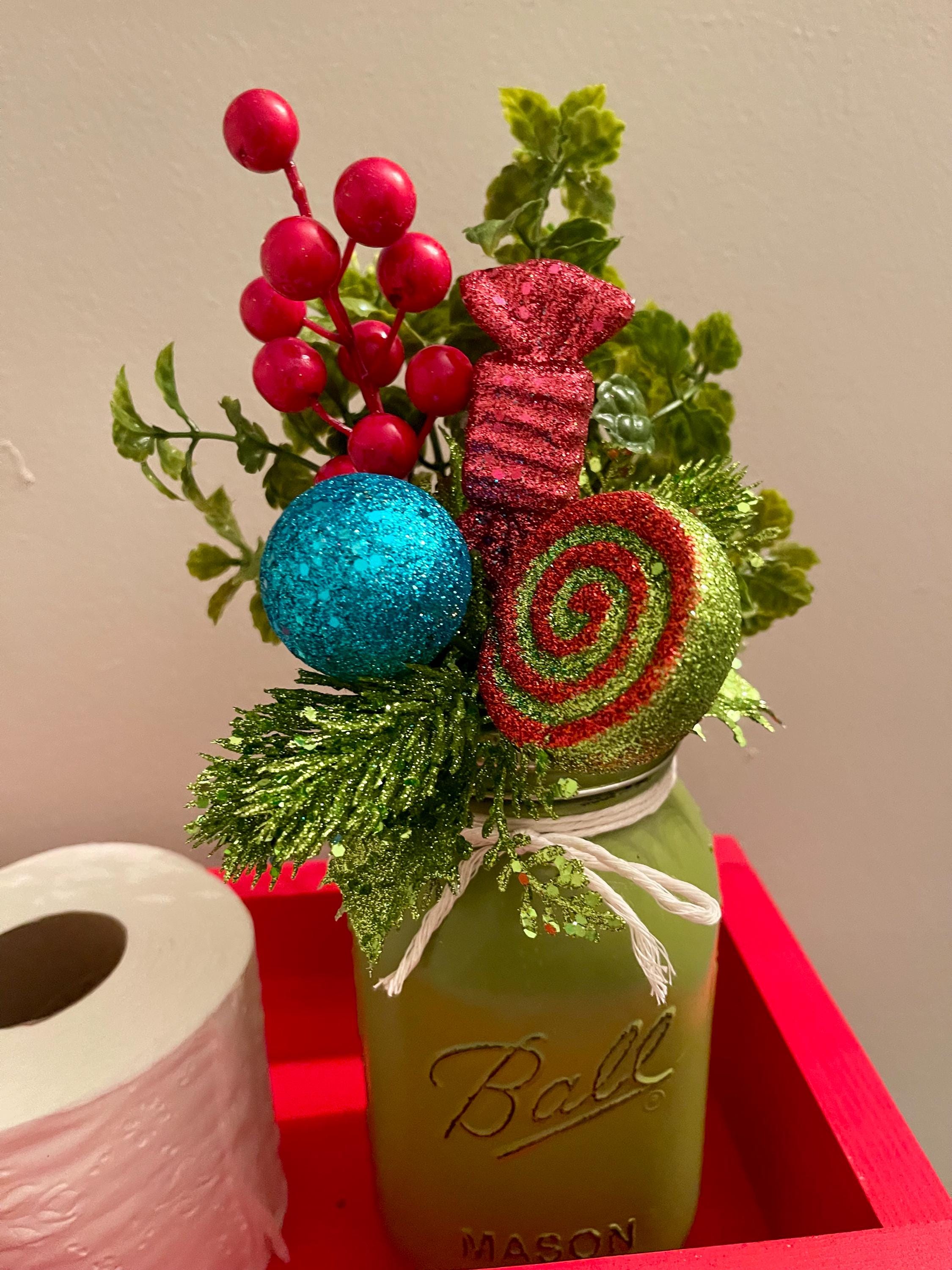 This handmade box has been painted in Grinch green and a glittery GRINCH face was attached. I added some fun Christmas bells to his hat for fun and sparkle and finished it off with the classic What's that Stench, It's Fantastic! A grinch green jar with white twine was added with some fun greenery and glittery accents that he is getting ready to STEAL:)