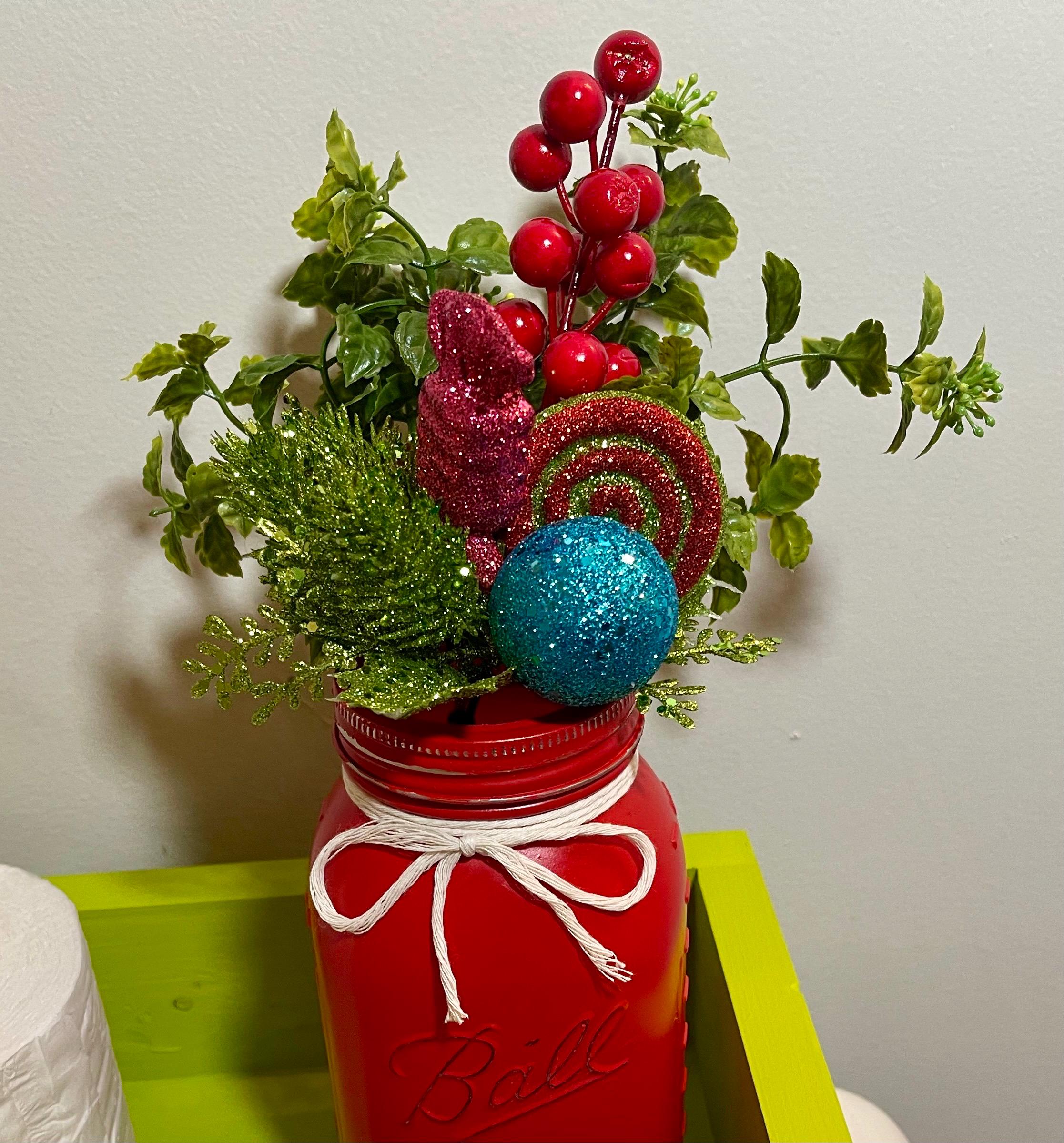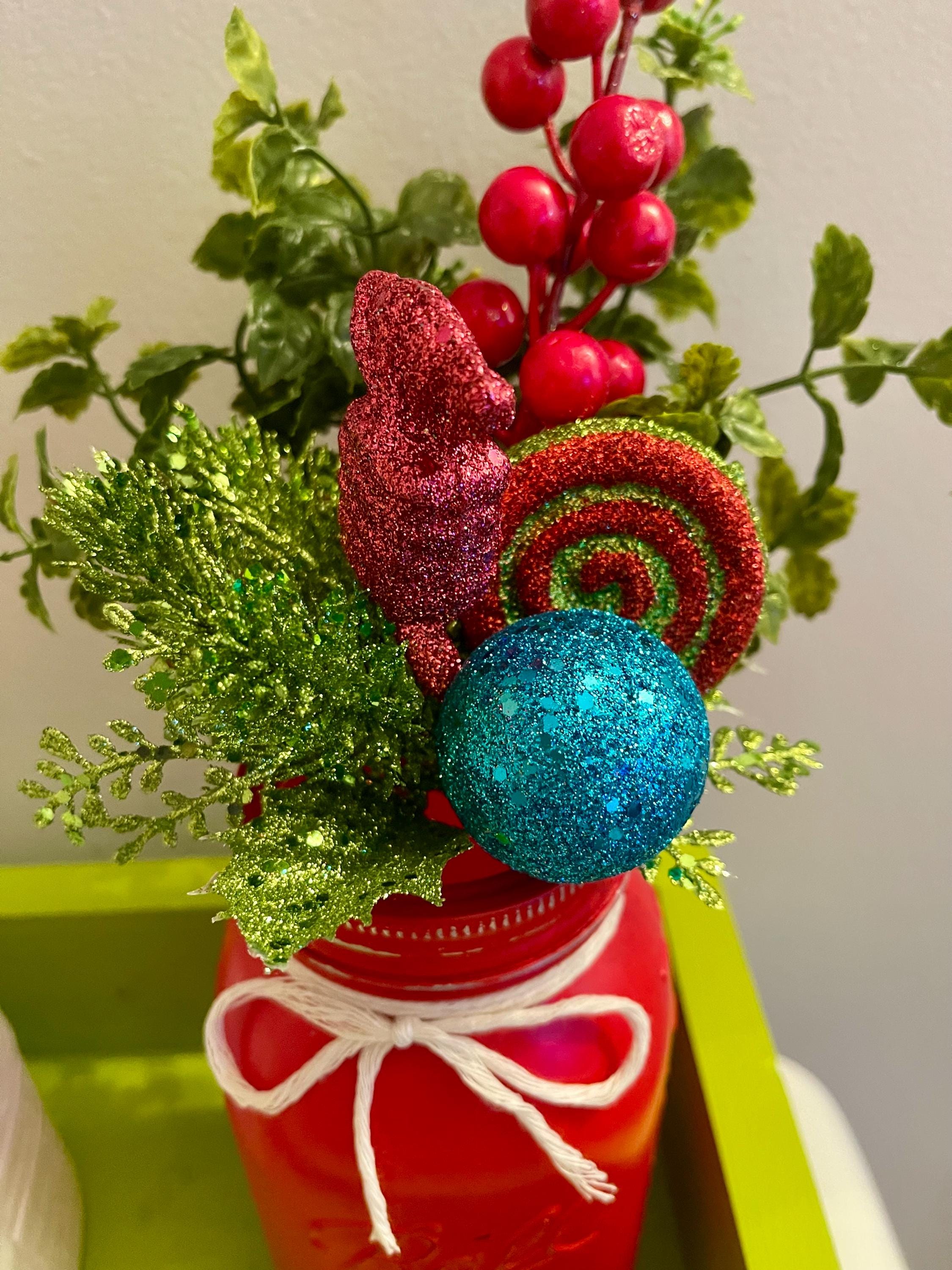 This handmade box has been painted in Grinch green and a glittery GRINCH face was attached. I added some fun Christmas bells to his hat for fun and sparkle and finished it off with the classic STINK STANK STUNK sign! A candy apple red jar with white twine was added with some fun greenery and glittery accents that he is getting ready to STEAL:)