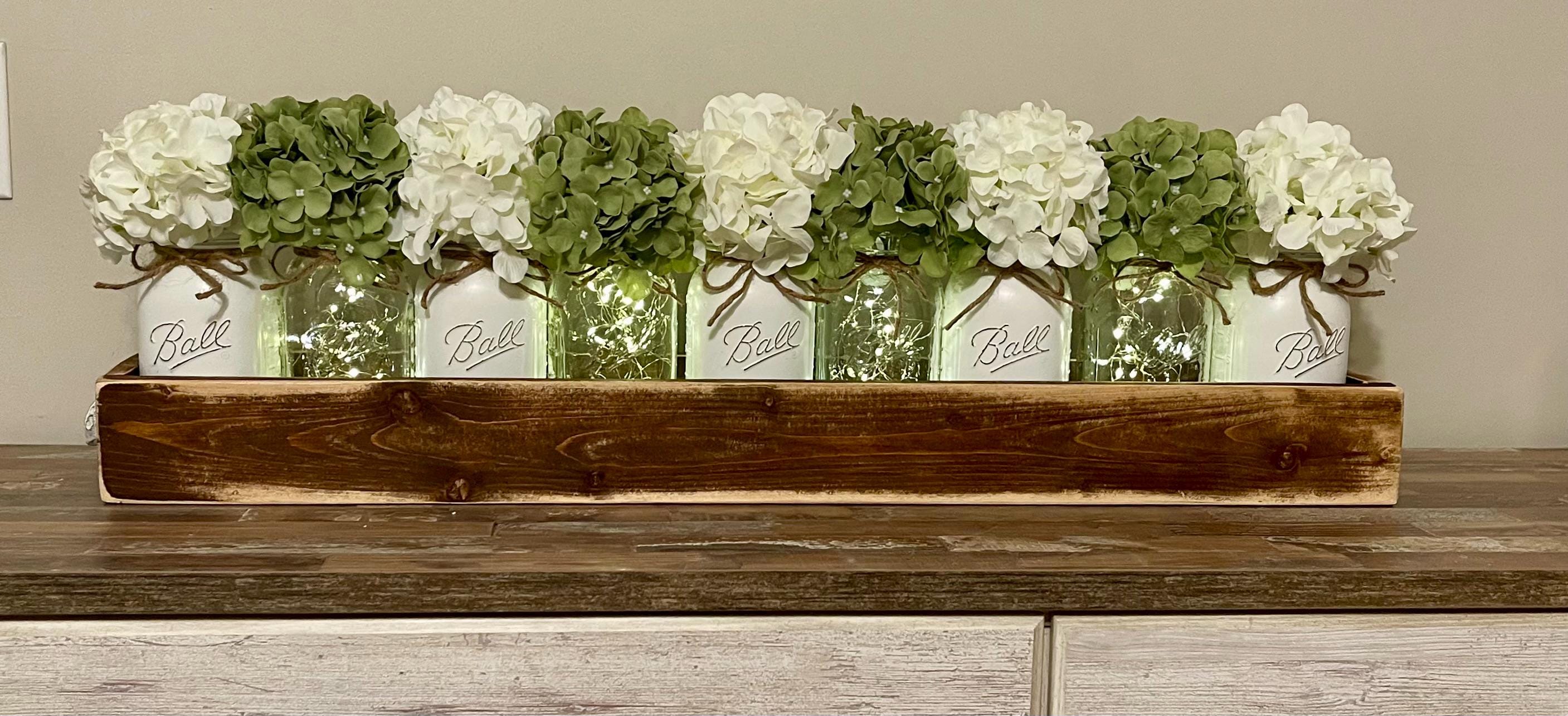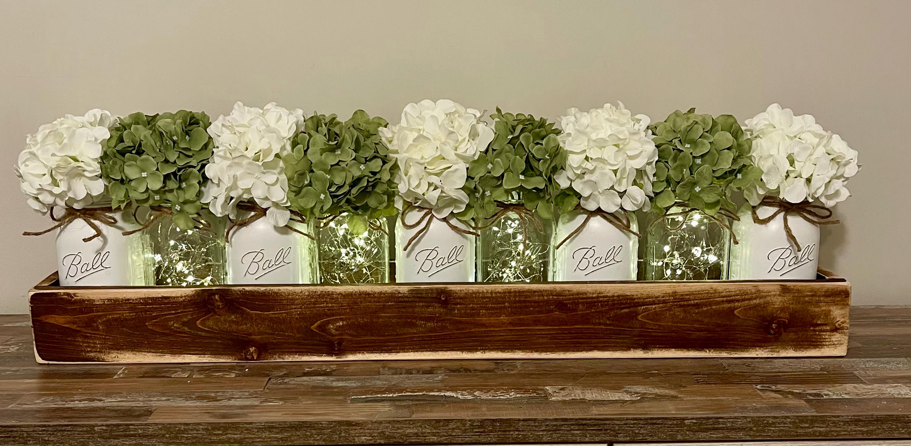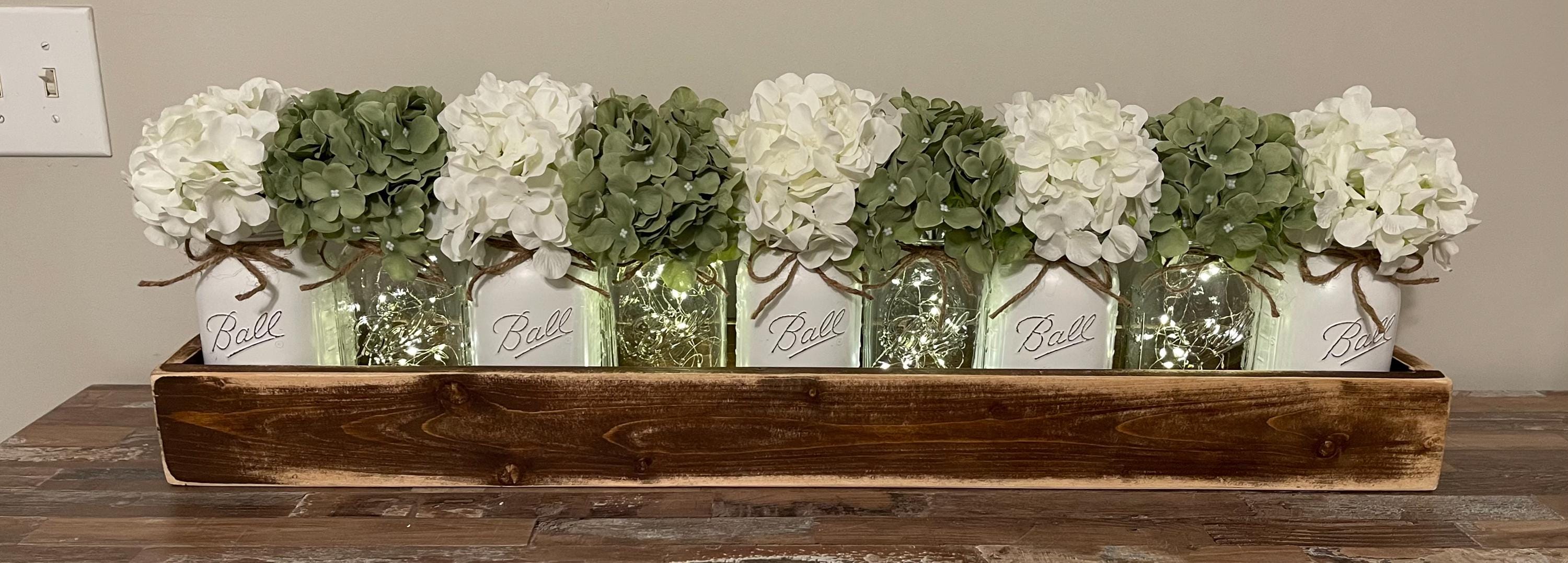 The box has been custom made and stained with a gorgeous deep walnut stain and given a heavy distress. Gorgeous ivory cast iron handles have been added to the sides to complete the modern farmhouse look and feel. Nine mason jars (shown with 5 white and 4 clear lit in main photo) have been painted and lightly distressed and twine has been added. They were then filled with huge, gorgeous white and green hydrangea and it just screams the elegance of a modern farmhouse design and you will be the ONLY one who has anything like it:)