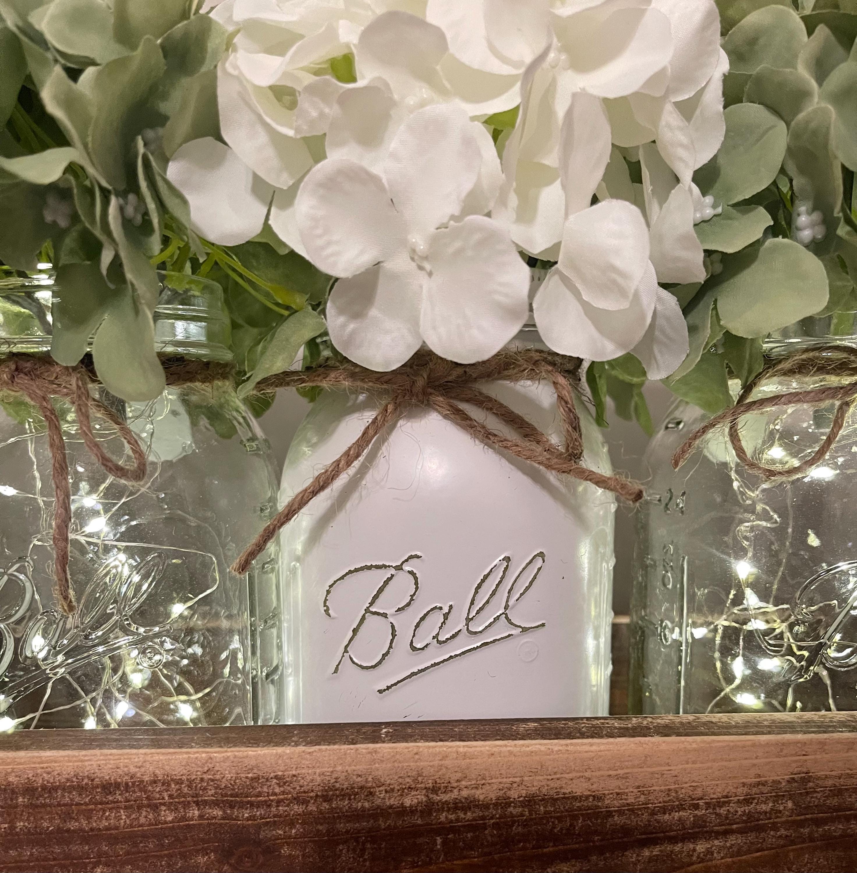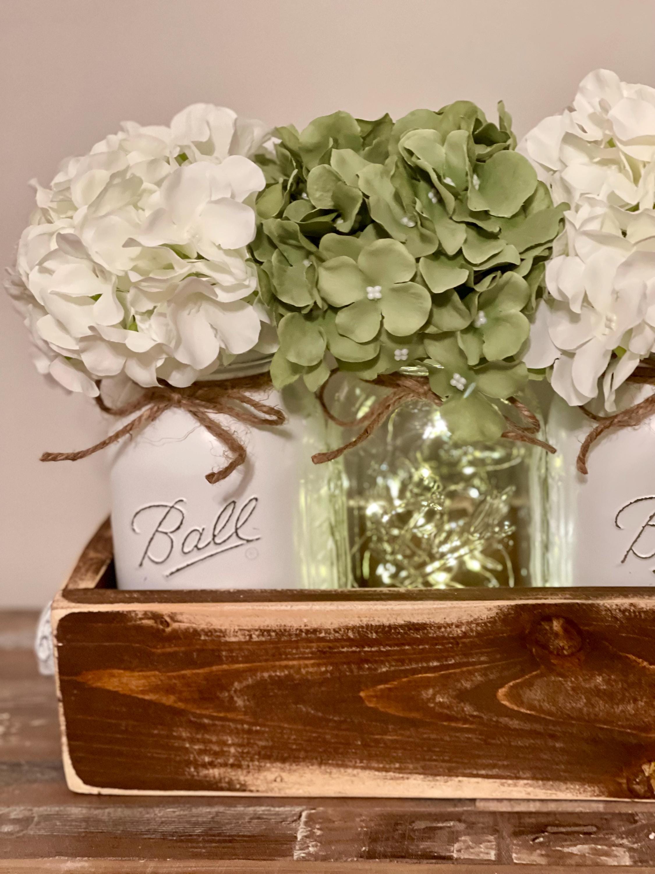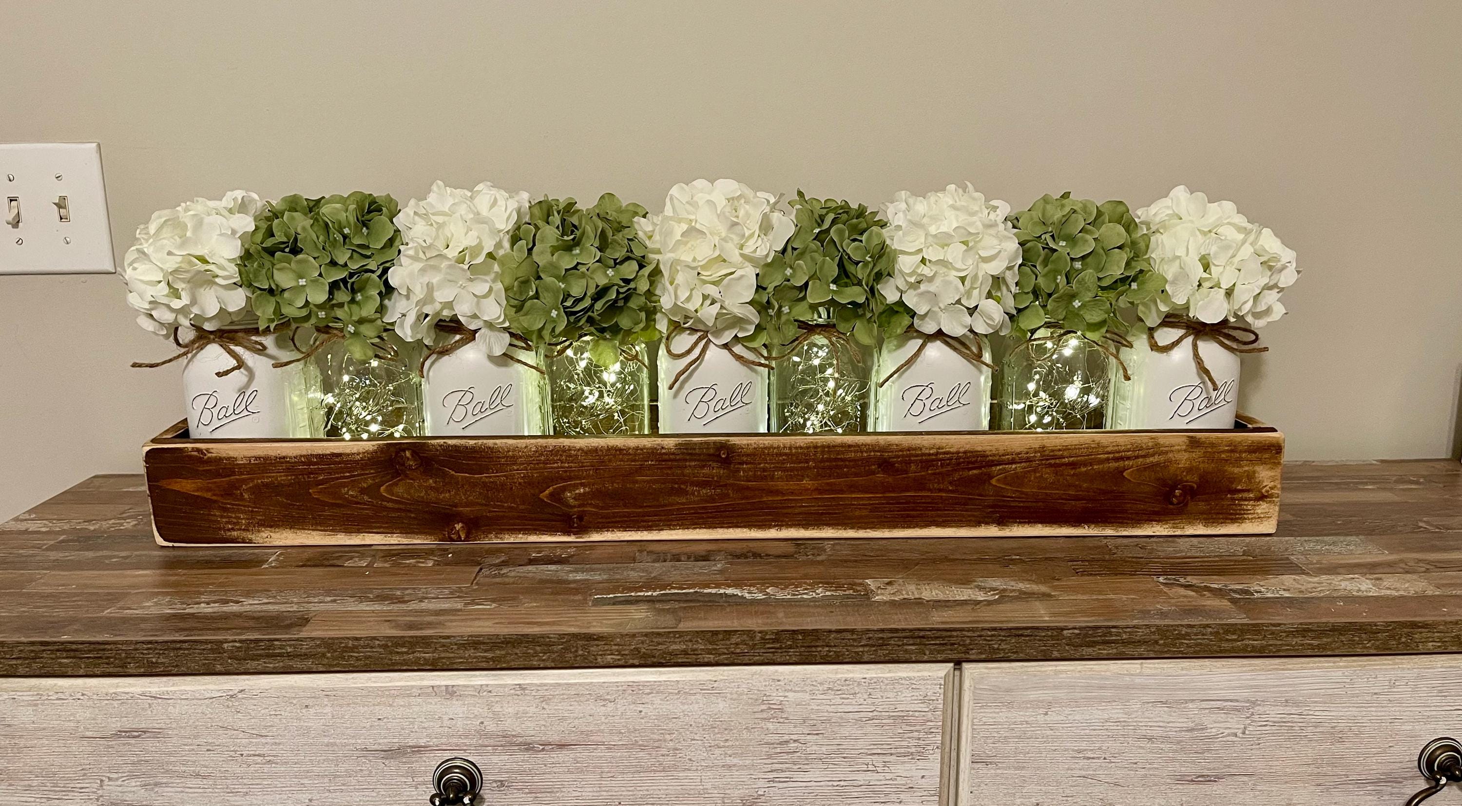 The box has been custom made and stained with a gorgeous deep walnut stain and given a heavy distress. Gorgeous ivory cast iron handles have been added to the sides to complete the modern farmhouse look and feel. Nine mason jars (shown with 5 white and 4 clear lit in main photo) have been painted and lightly distressed and twine has been added. They were then filled with huge, gorgeous white and green hydrangea and it just screams the elegance of a modern farmhouse design and you will be the ONLY one who has anything like it:)