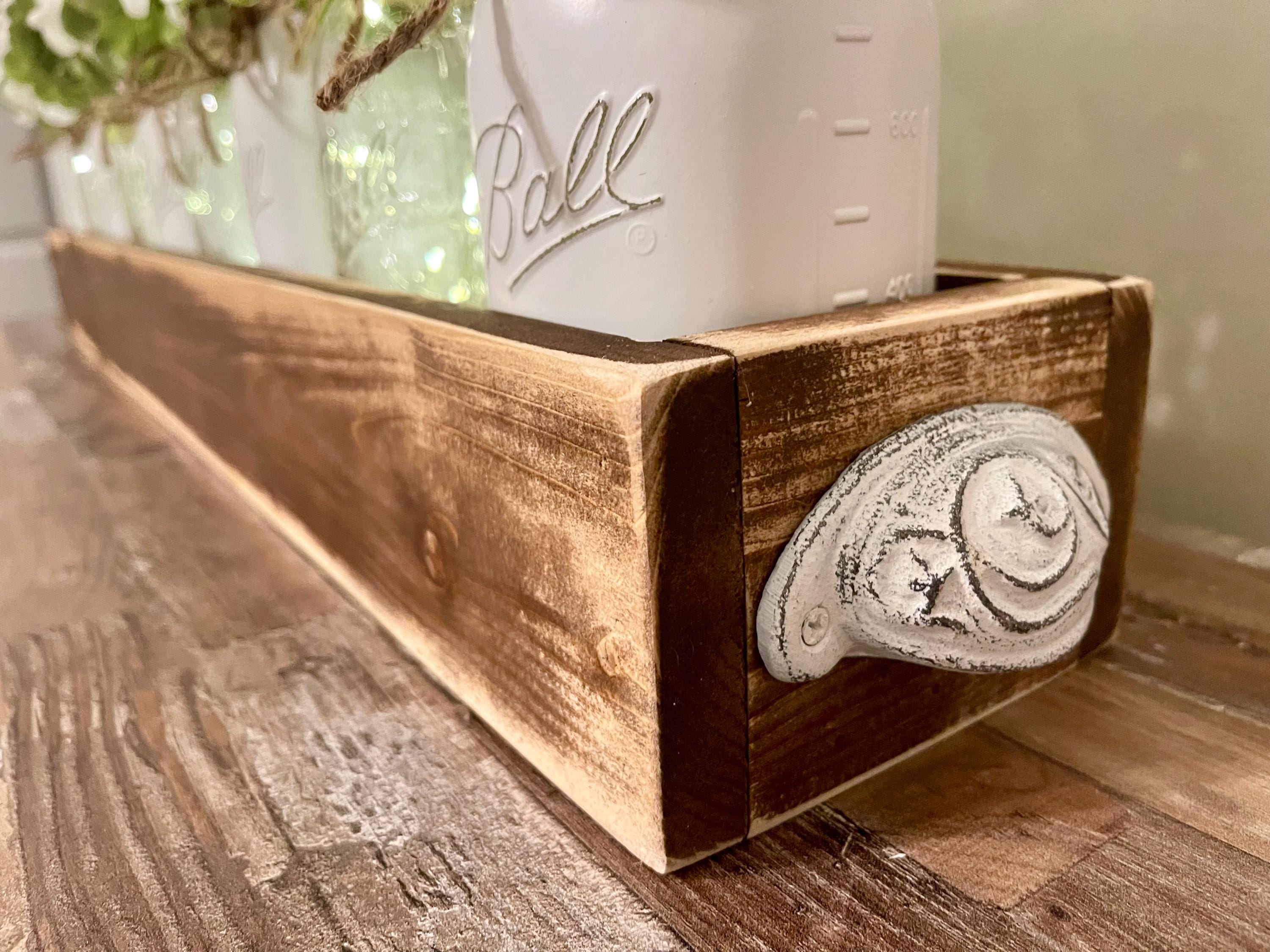 Want a coastal/beachy look, this box is beautiful in our driftwood stain and with our tiffany jars and clear lit jars....perfect for a beach or lakehouse table.