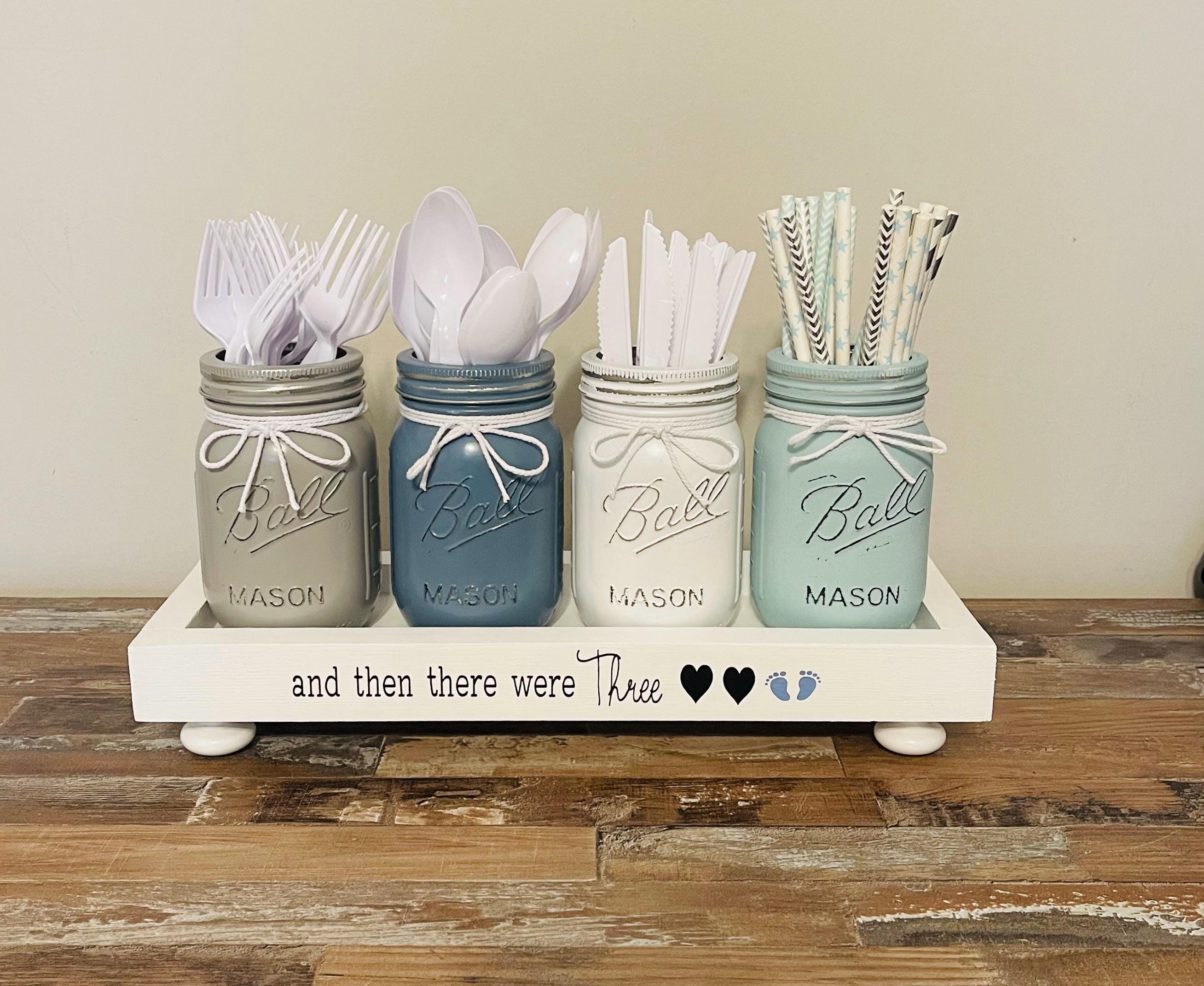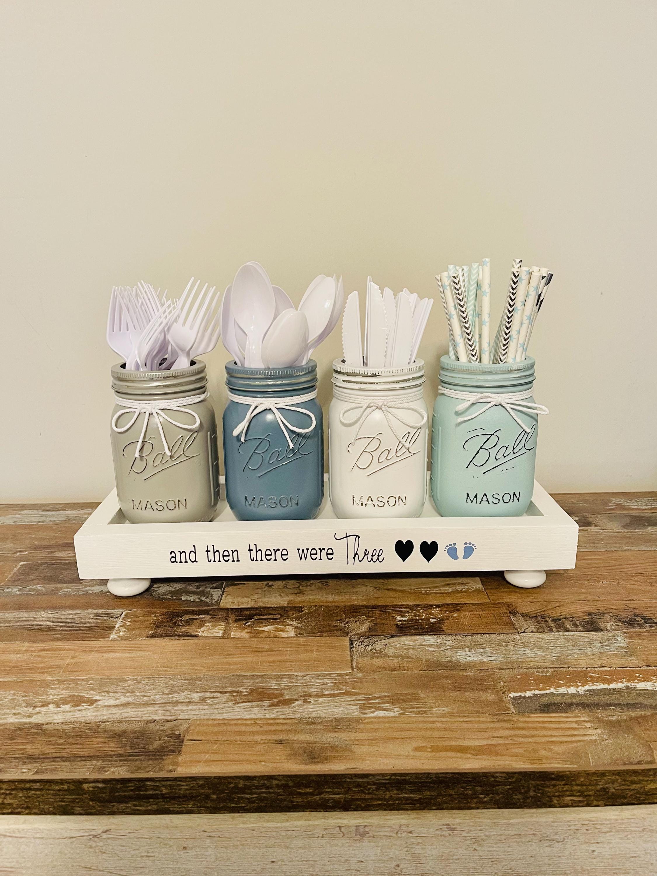 Baby Shower Utensil Holder with Wood Riser - And Then There Were 3 Nursery Decor Centerpiece