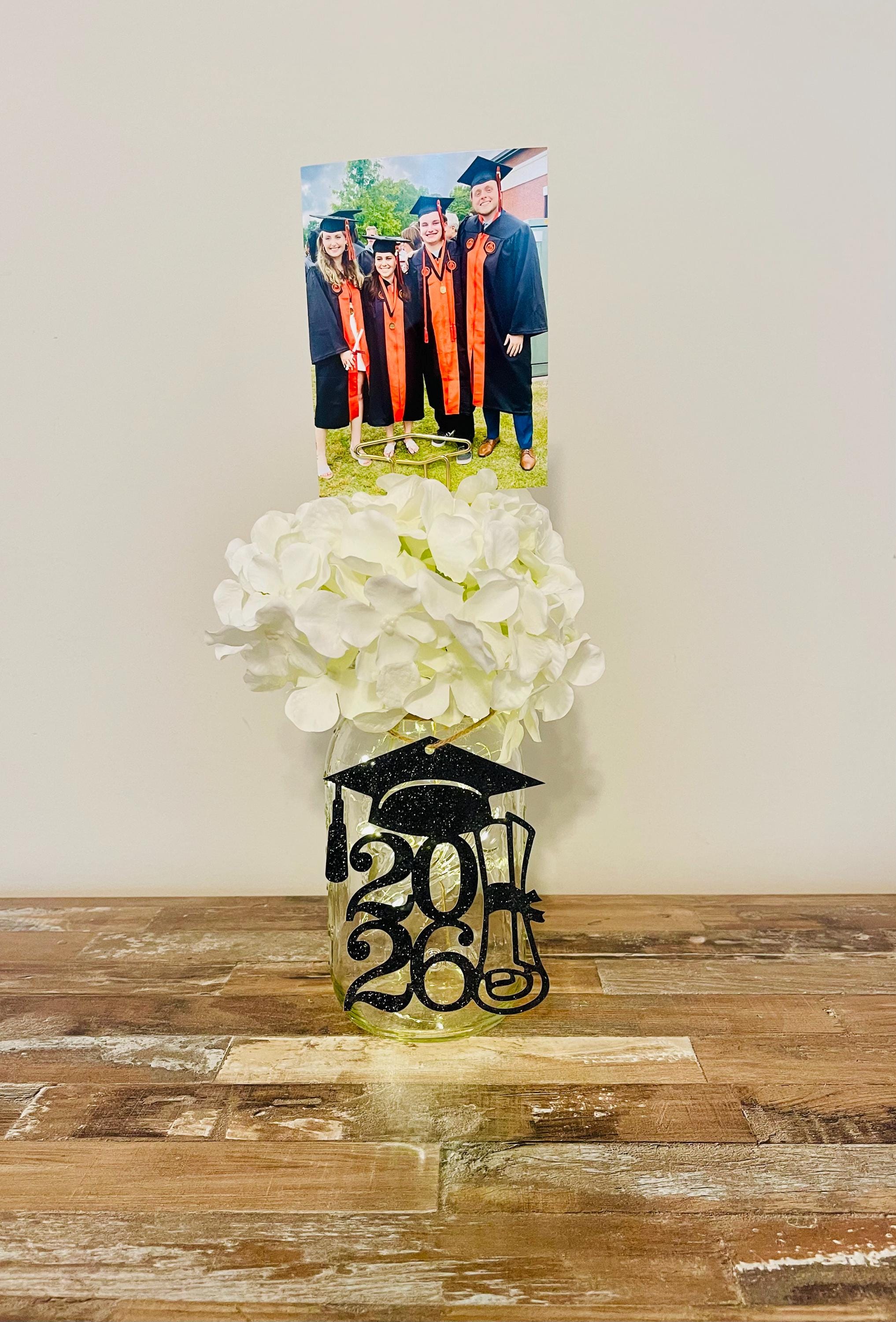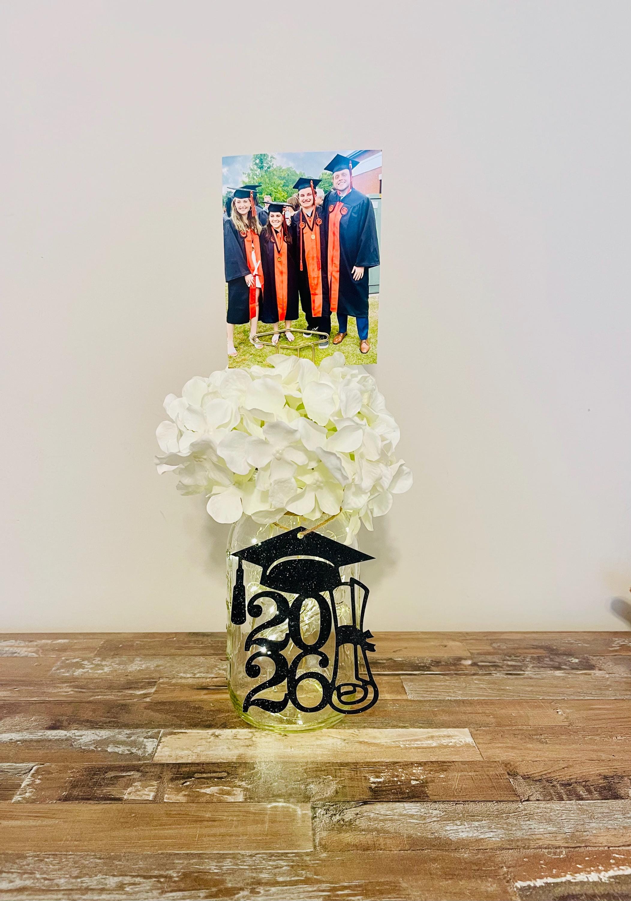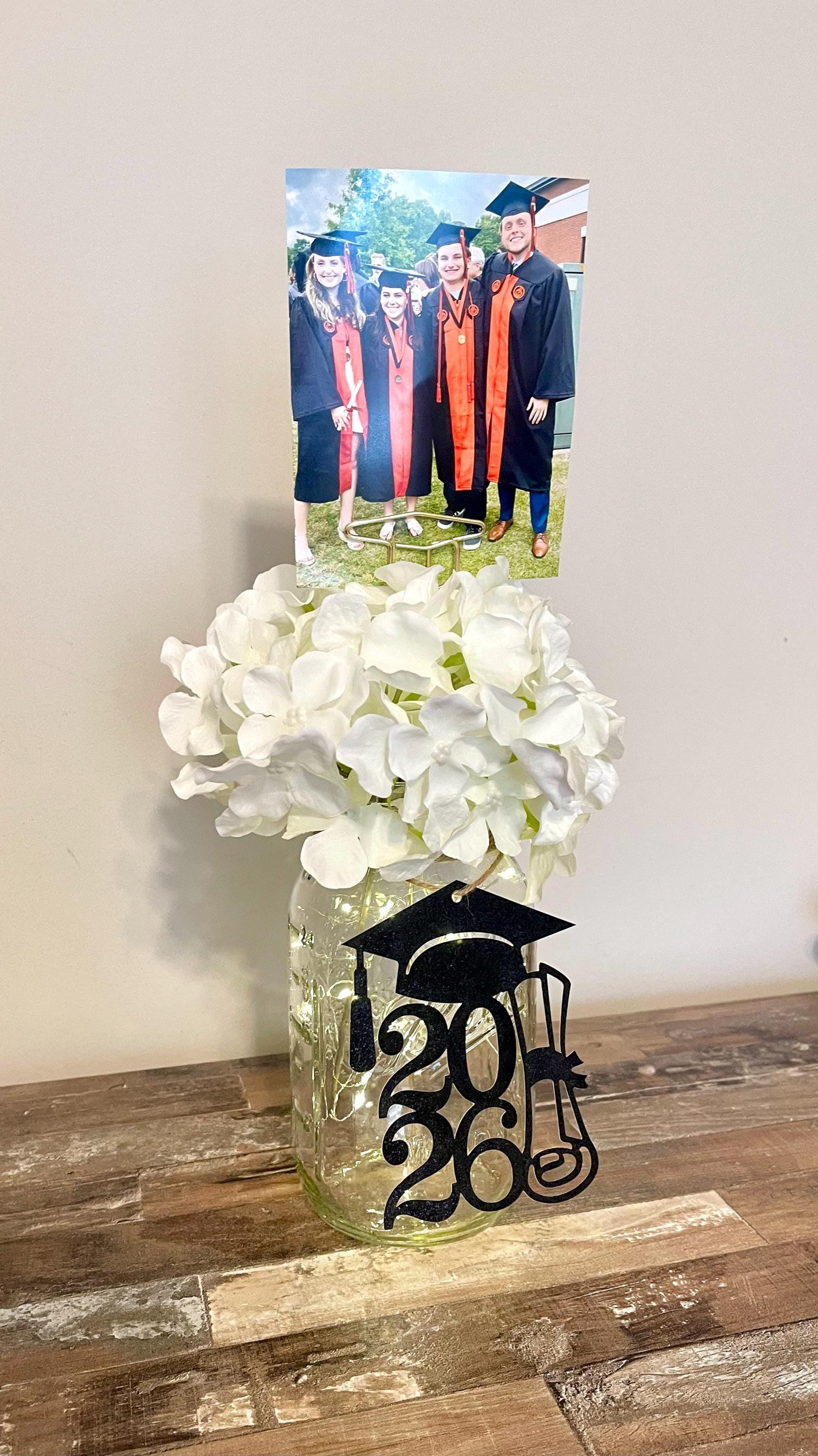 Your all-in-one photo centerpiece for your GRADUATION PARTY! This listing includes the clear lit 32 oz. quart sized Ball mason jar with twine, flower of your choosing (see listing photos) and a 12" graduation cap photo holder to peek out of the flowers with fun pictures of the graduate and his/her friends or baby photos and your choice of black glitter tag for the jar. The flower pick is a graduation cap...sooo fun!