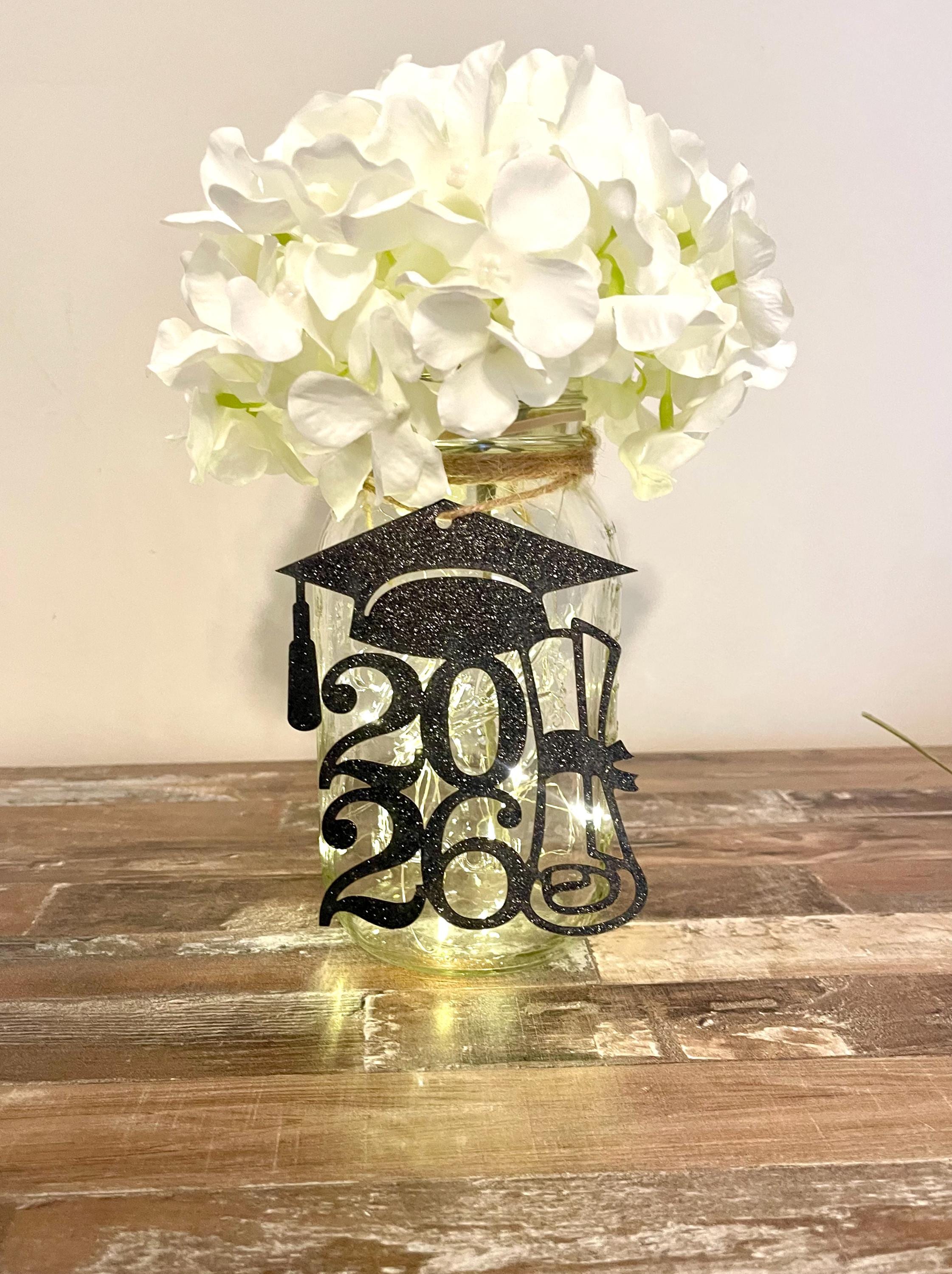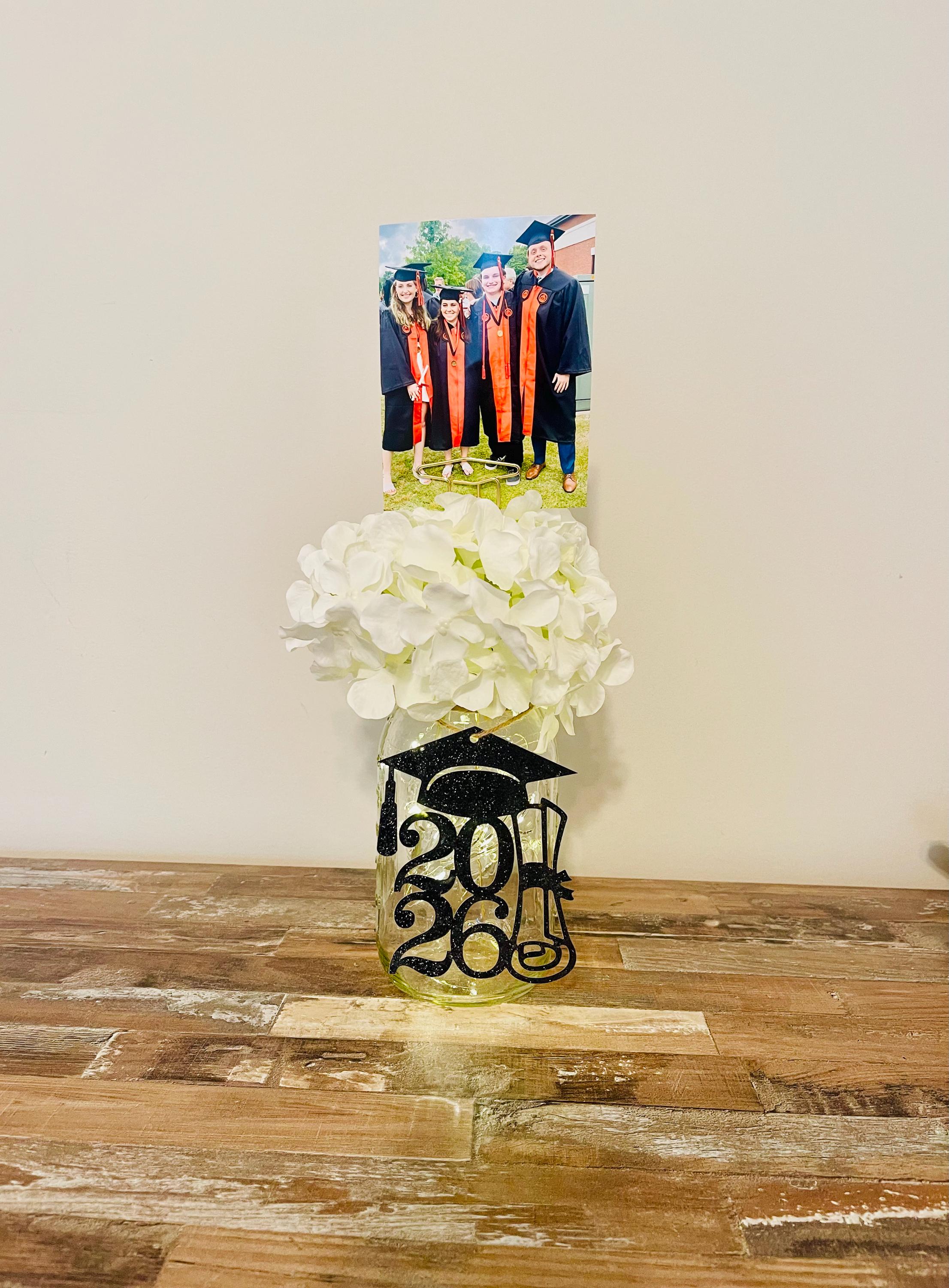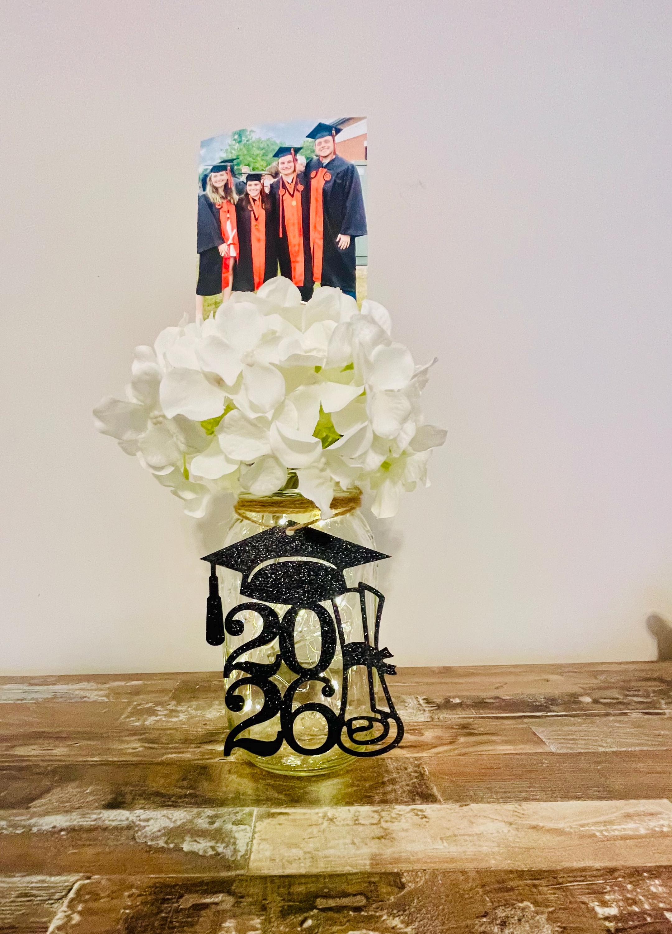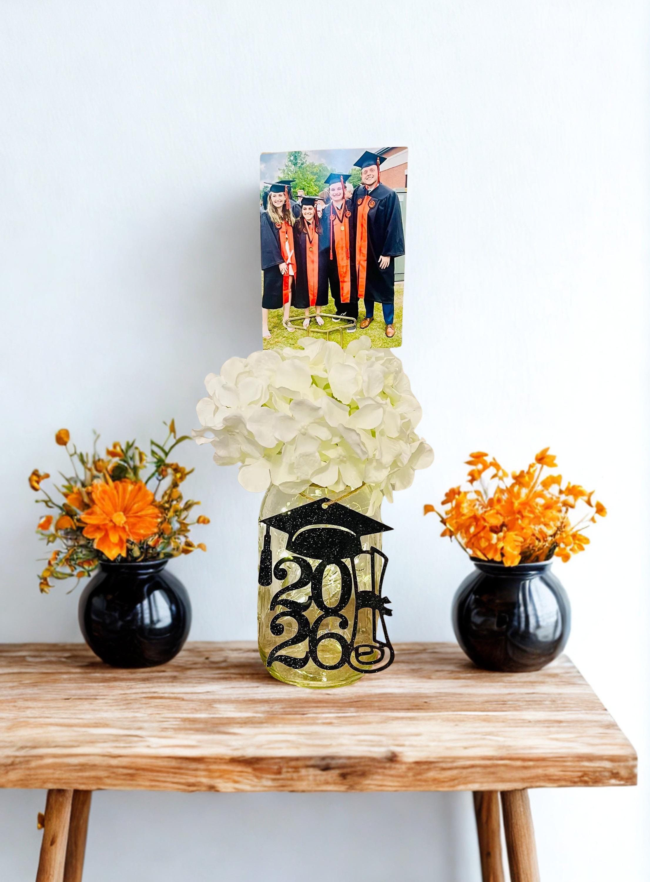 Your all-in-one photo centerpiece for your GRADUATION PARTY! This listing includes the clear lit 32 oz. quart sized Ball mason jar with twine, flower of your choosing (see listing photos) and a 12" graduation cap photo holder to peek out of the flowers with fun pictures of the graduate and his/her friends or baby photos and your choice of black glitter tag for the jar. The flower pick is a graduation cap...sooo fun!