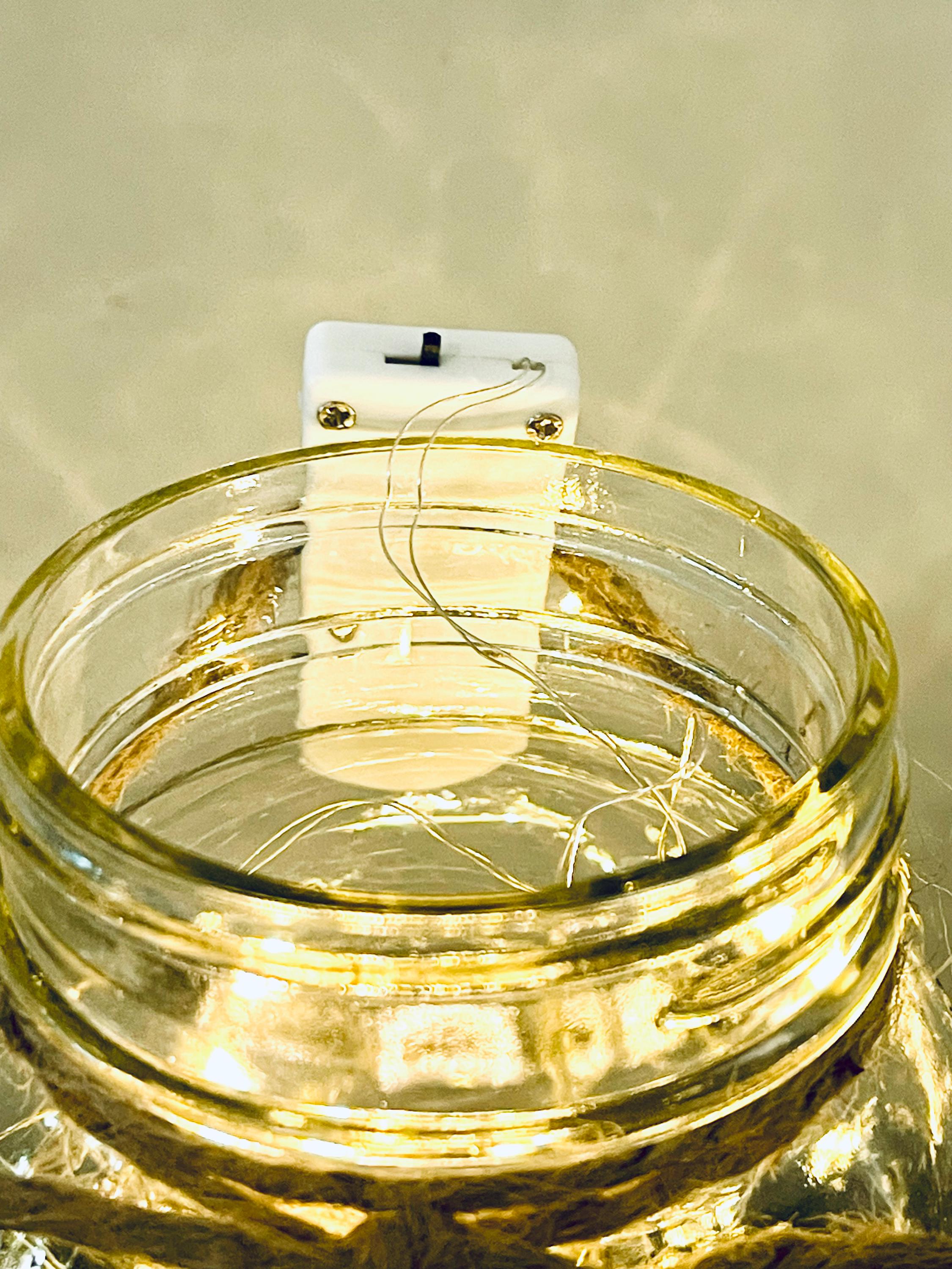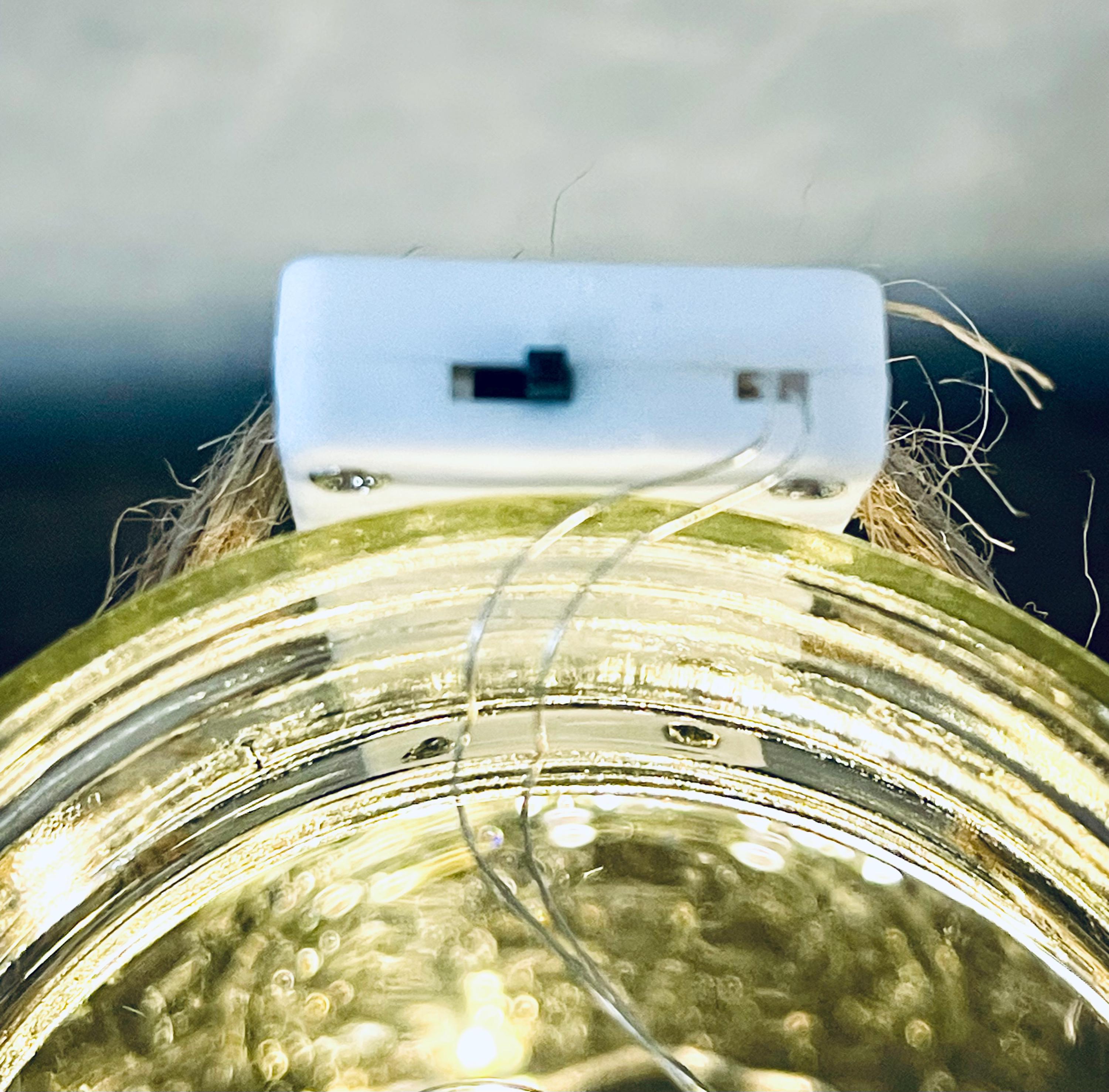 The fairy lights have an on/off switch on the top...see photos...and once a flower is placed in the jar, the fairy light box is hidden (see last 2 photos with the green hydrangea...front and back)