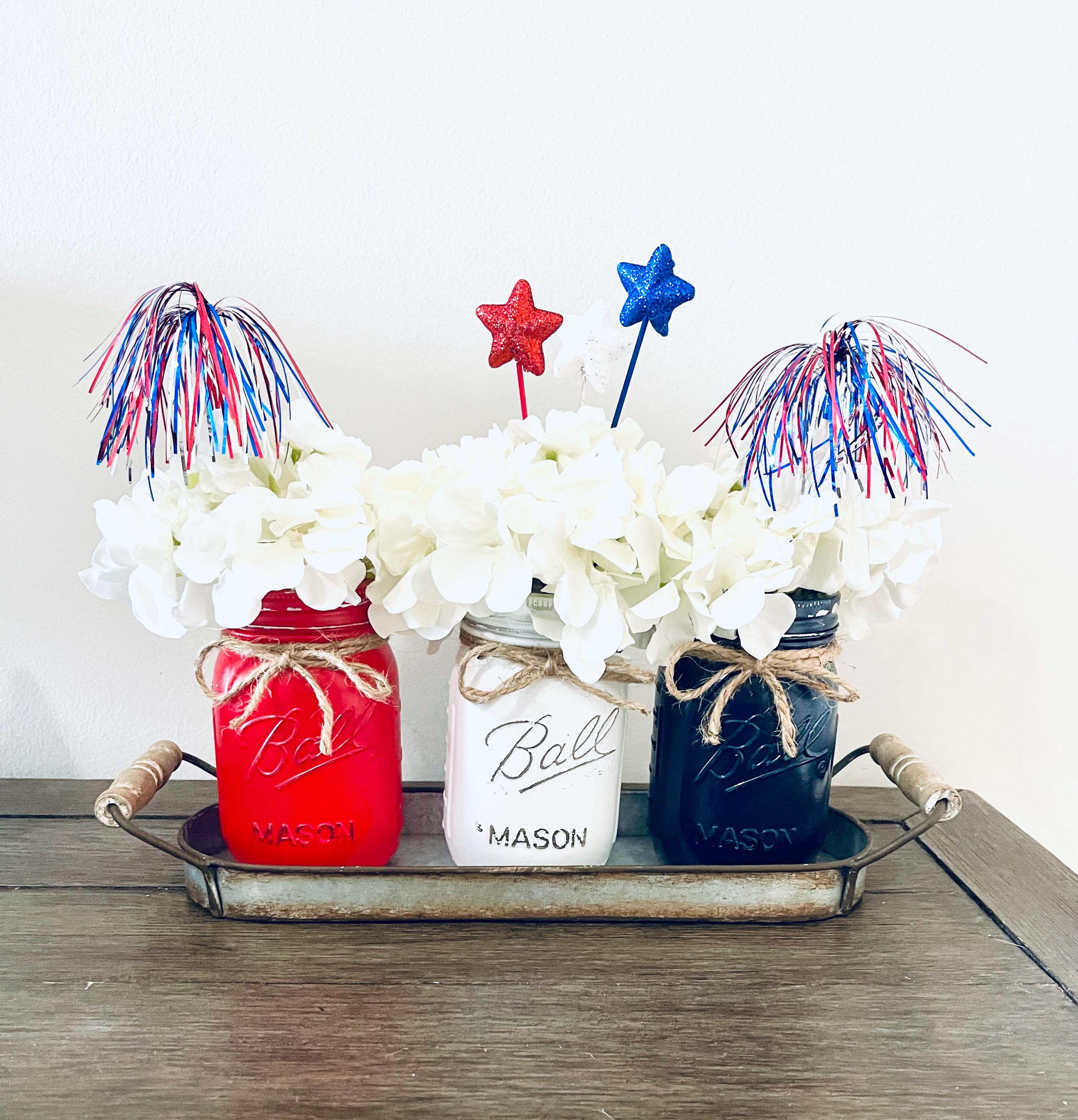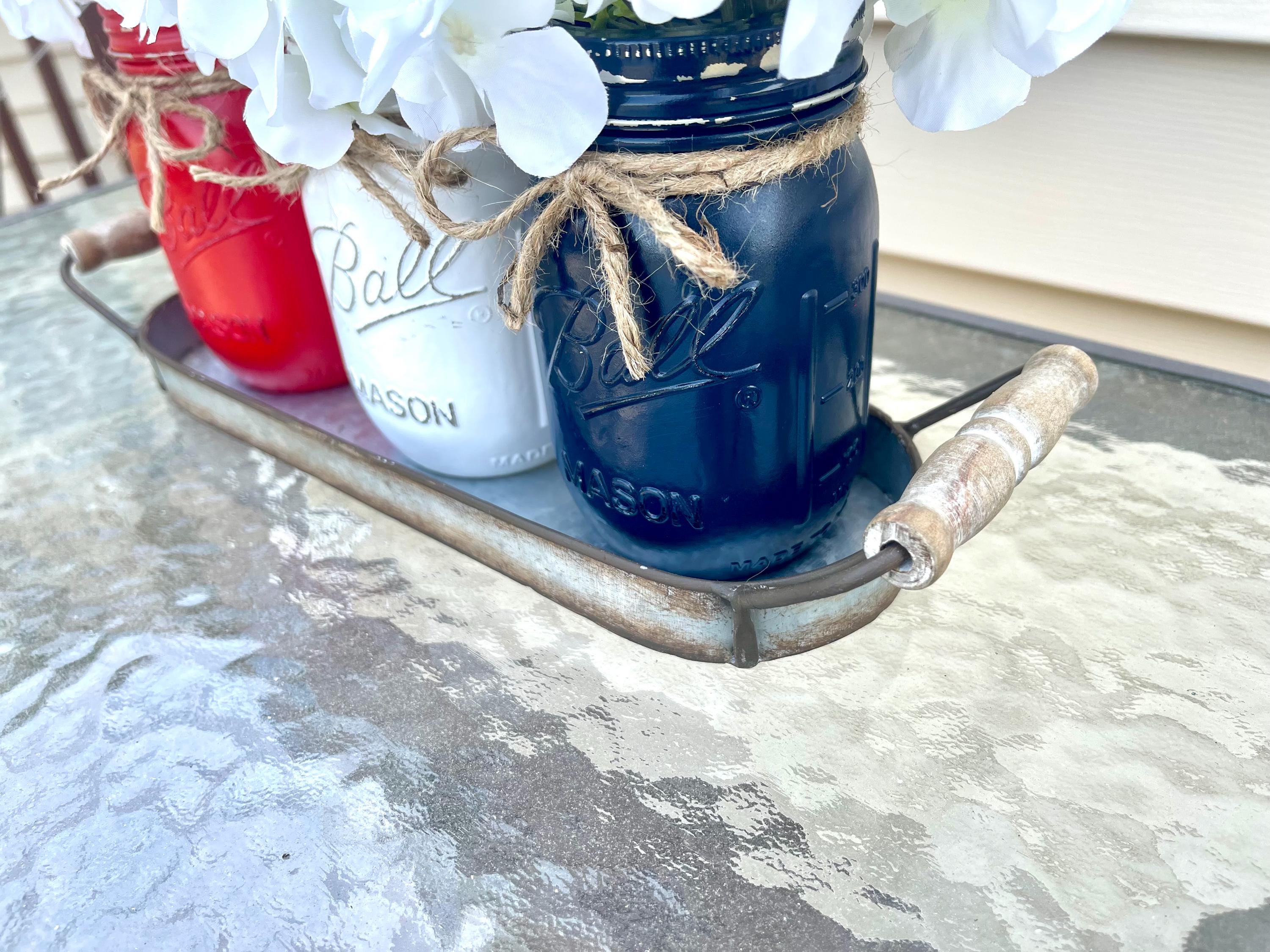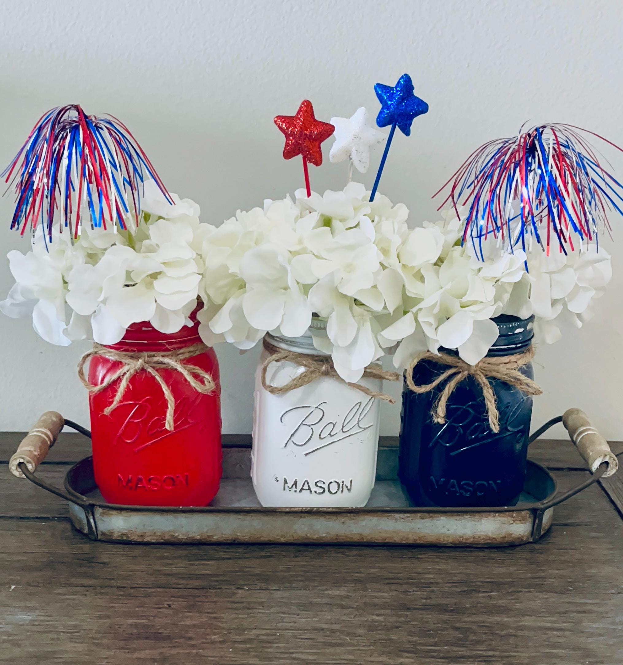 The 3 pint jars are painted in candy apple red, white and navy and distressed and twine was added. Gorgeous white hydrangeas were added to fill it up and fun sparklers and red, white and blue glitter stars were added to give it that summer cookout vibe! All of this was placed on a gorgeous modern farmhouse metal tray with handles....it is ready to go right on your table or entryway when you get it home.