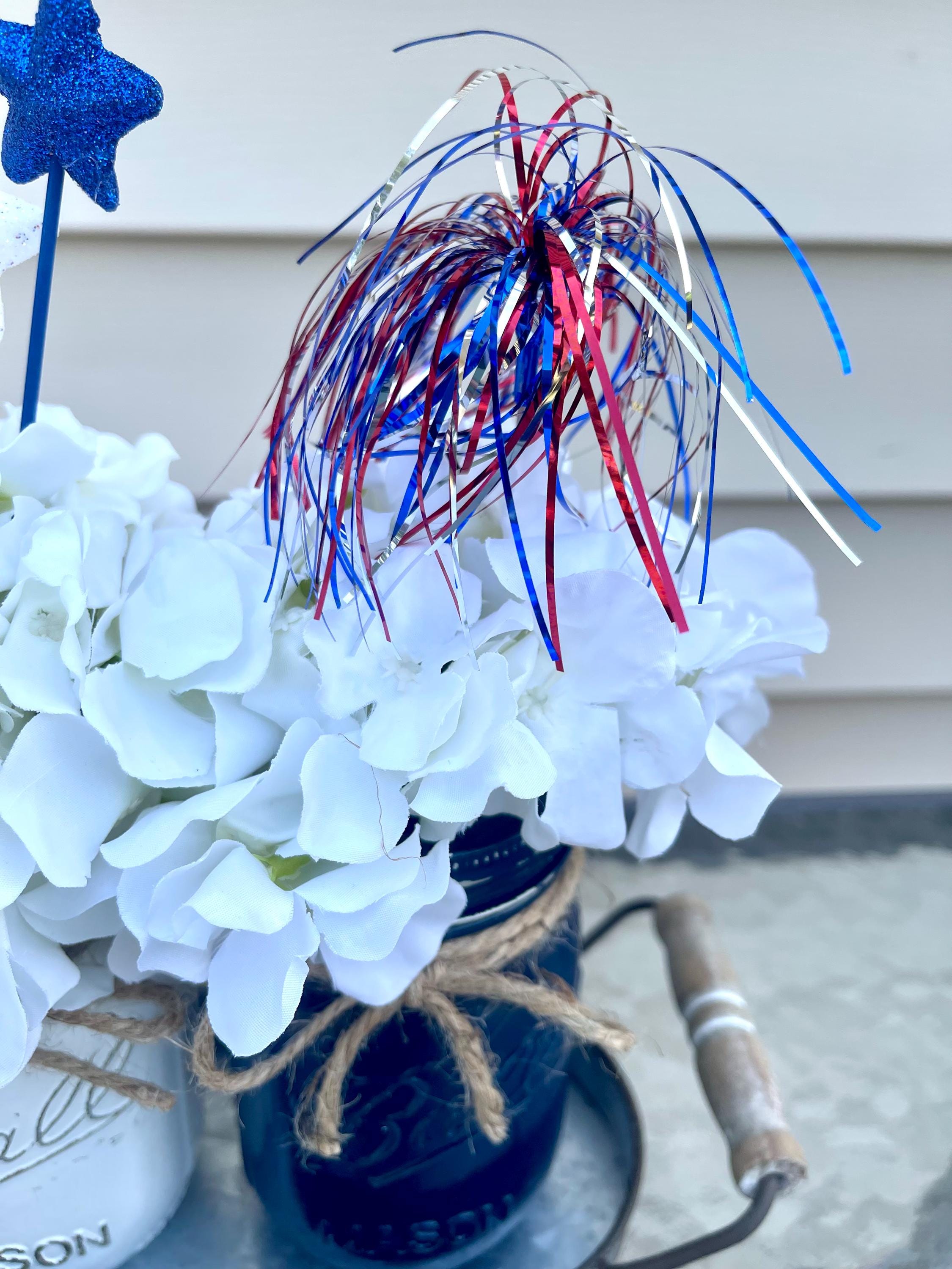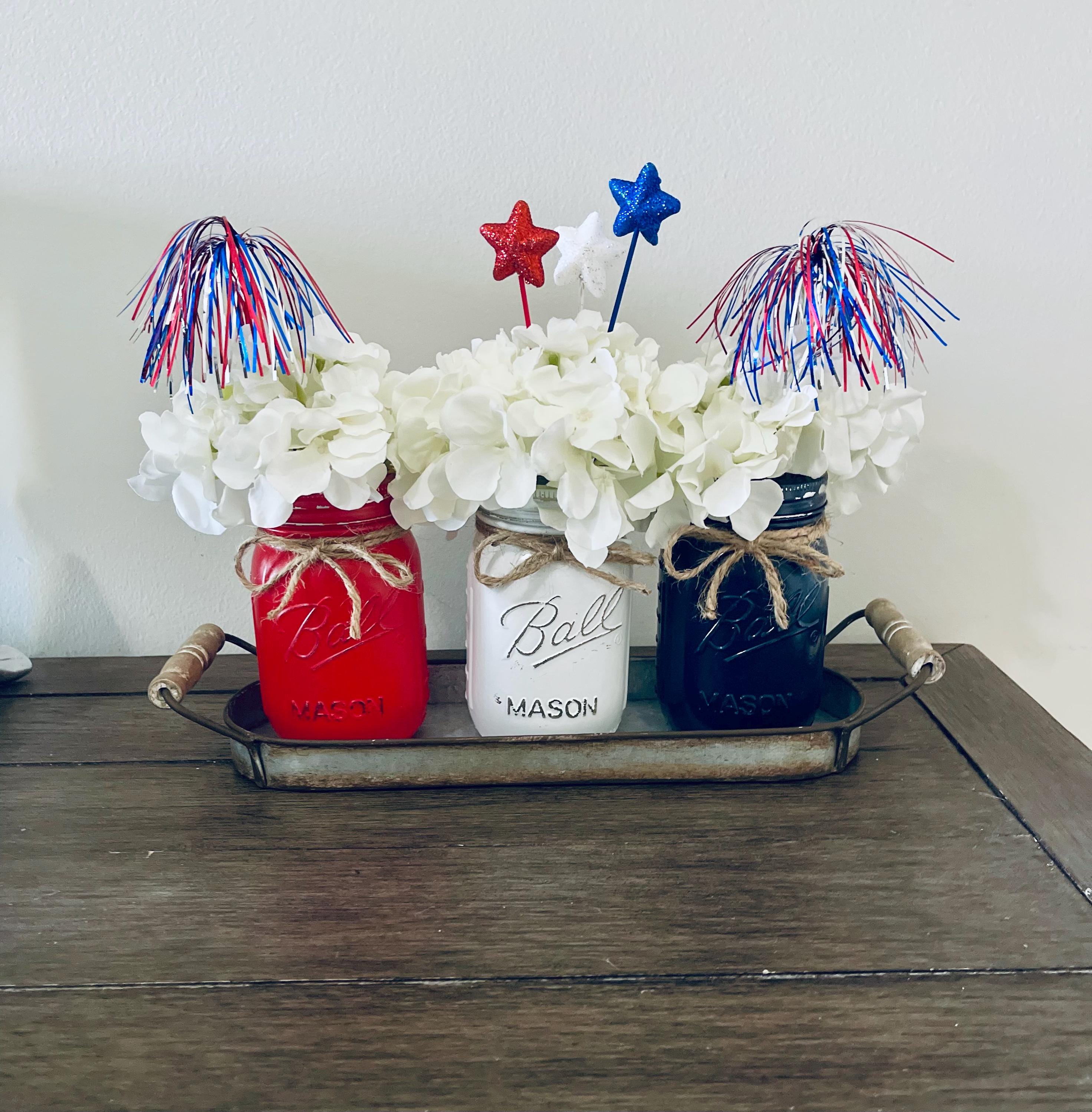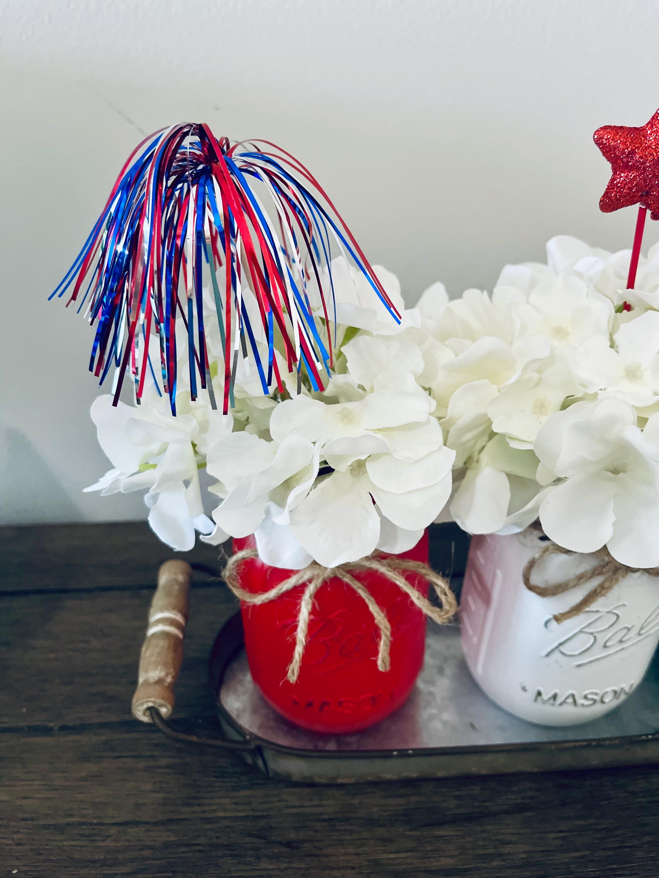 The 3 pint jars are painted in candy apple red, white and navy and distressed and twine was added. Gorgeous white hydrangeas were added to fill it up and fun sparklers and red, white and blue glitter stars were added to give it that summer cookout vibe! All of this was placed on a gorgeous modern farmhouse metal tray with handles....it is ready to go right on your table or entryway when you get it home.