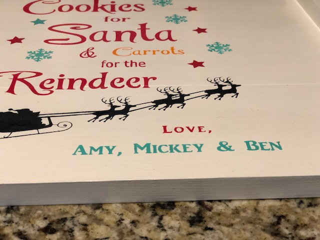 It is our witty wood serving tray and it has been painted with two coats of white paint and hand painted with multiple fun Christmas colors to make it POP in your home decor for the Holidays.