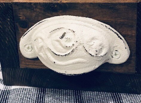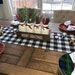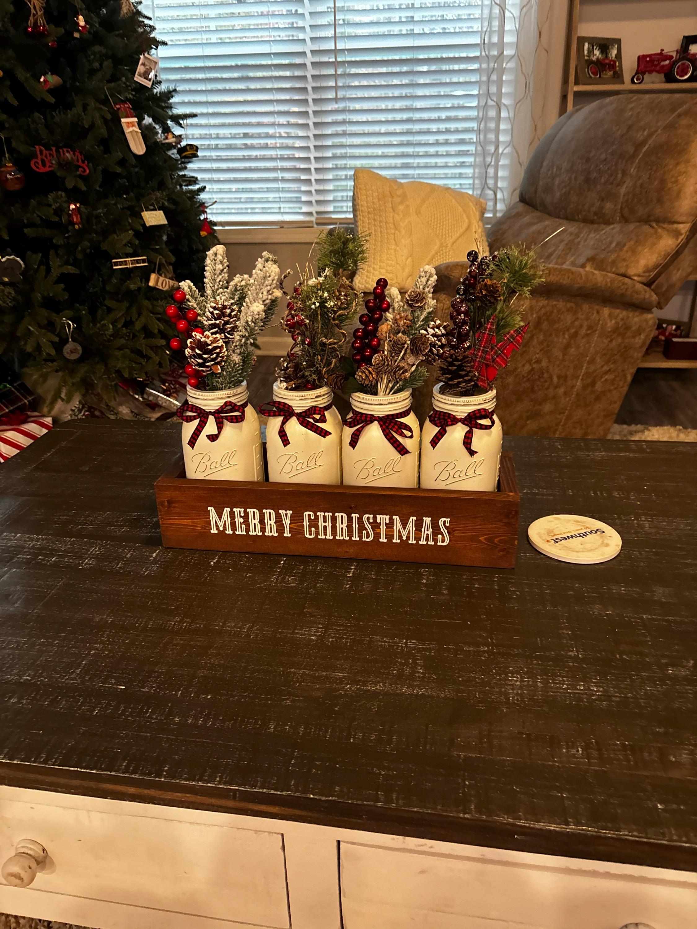 The box has been hand made and stained in a gorgeous walnut stain and four linen jars have been painted and distressed and tied up with red/black gingham ribbon. Pinecones, Christmas frosted greenery and red berries make this item POP and I added a sweet litle red/black gingham Christmas tree pick to complete it. Ivory cast iron handles have been added to give it even more farmhouse charm.